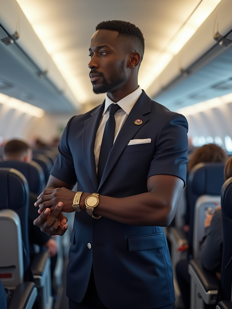 model as a flight attendant demonstrating safety procedures, wearing an authoritative presence in a professional flight attendant uniform with tie and muscular build, standing in the aisle with oxygen mask