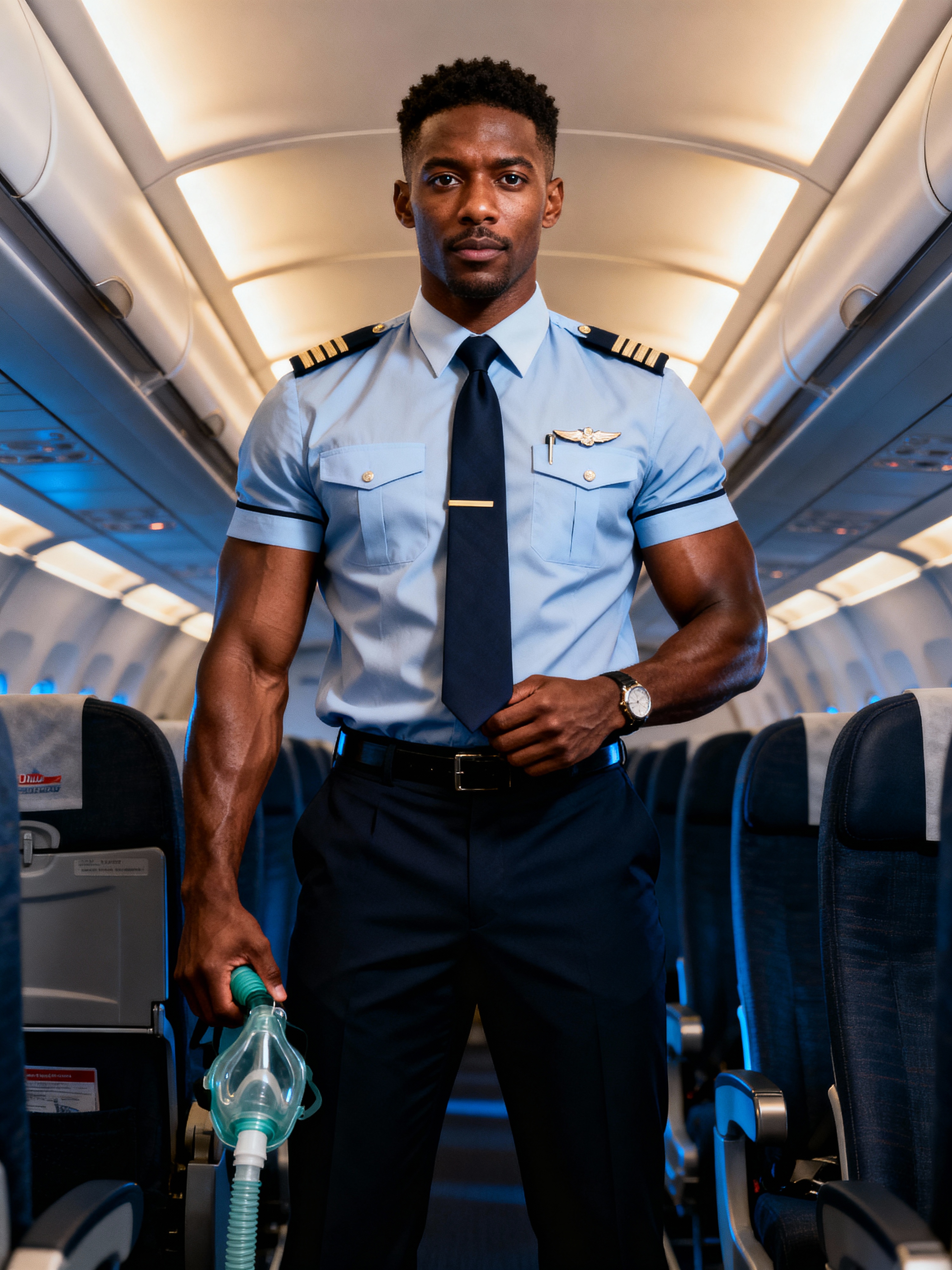 model as a flight attendant demonstrating safety procedures, wearing an authoritative presence in a professional flight attendant uniform with tie and muscular build, standing in the aisle with oxygen mask