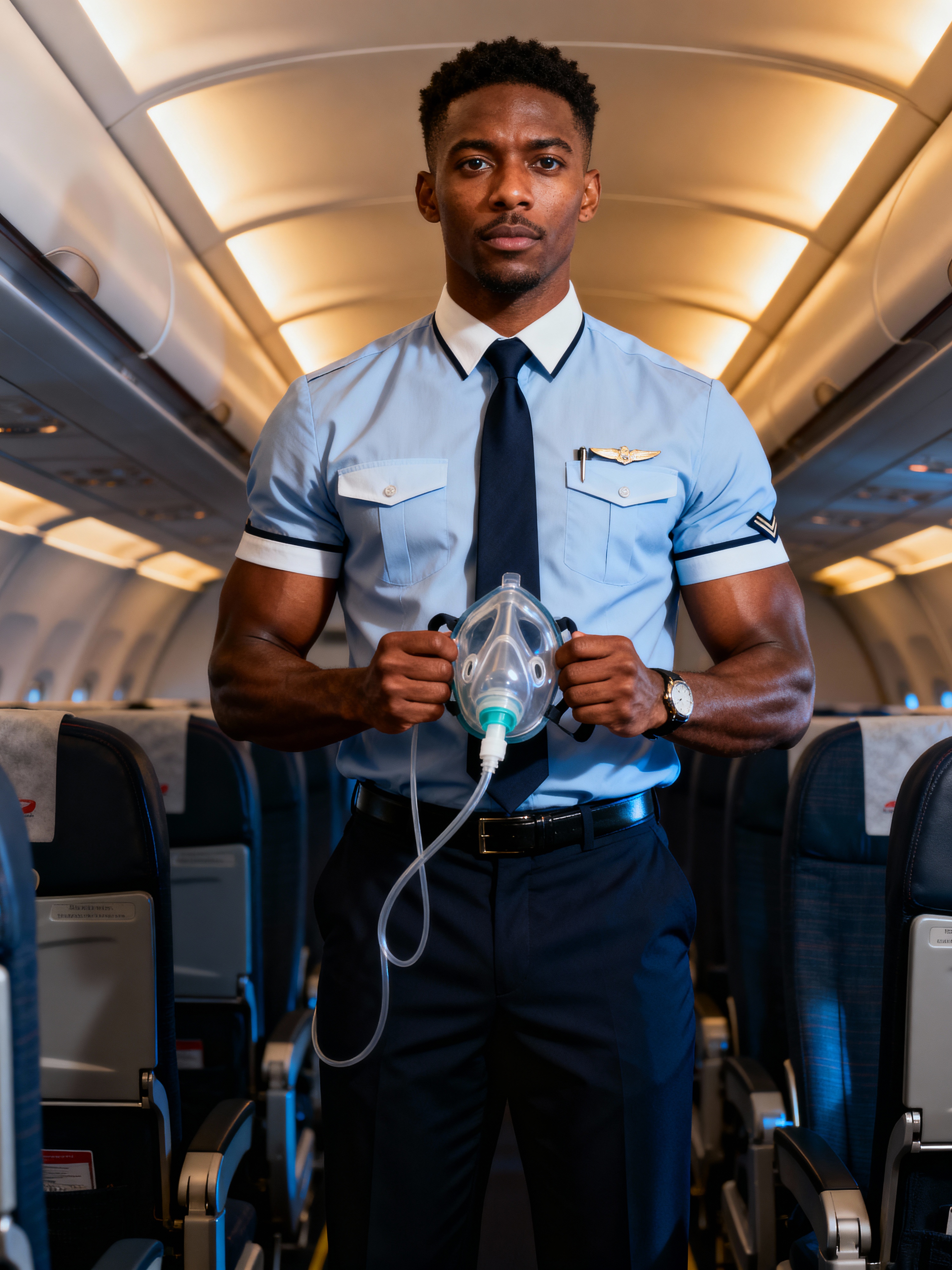 model as a flight attendant demonstrating safety procedures, wearing an authoritative presence in a professional flight attendant uniform with tie and muscular build, standing in the aisle with oxygen mask