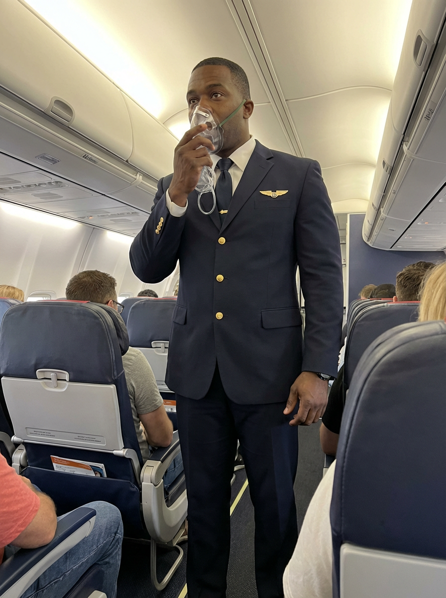 model as a flight attendant demonstrating safety procedures, wearing an authoritative presence in a professional flight attendant uniform with tie and muscular build, standing in the aisle with oxygen mask