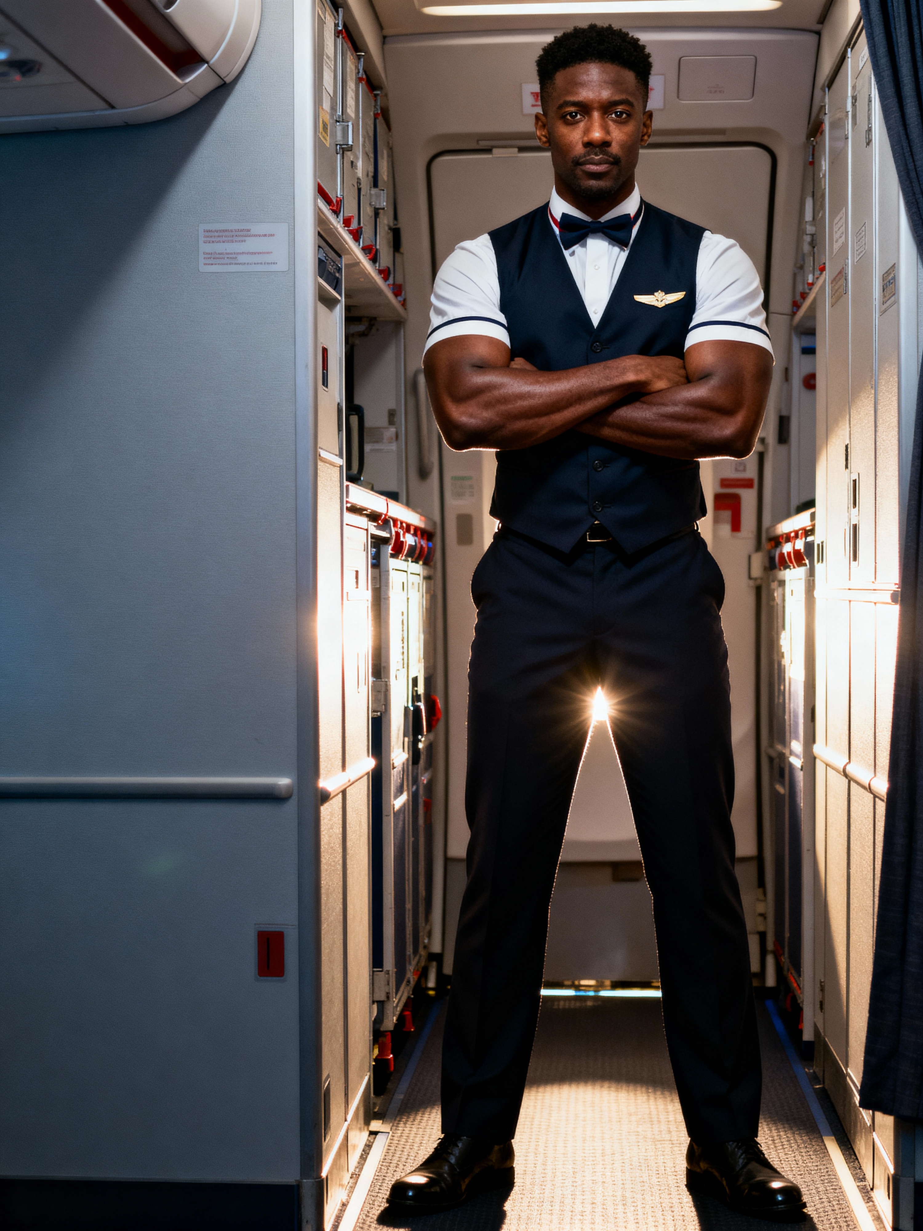 model as a flight attendant in aircraft aisle, wearing a powerful presence in a professional flight attendant uniform with vest and strong arms, performing cabin checks