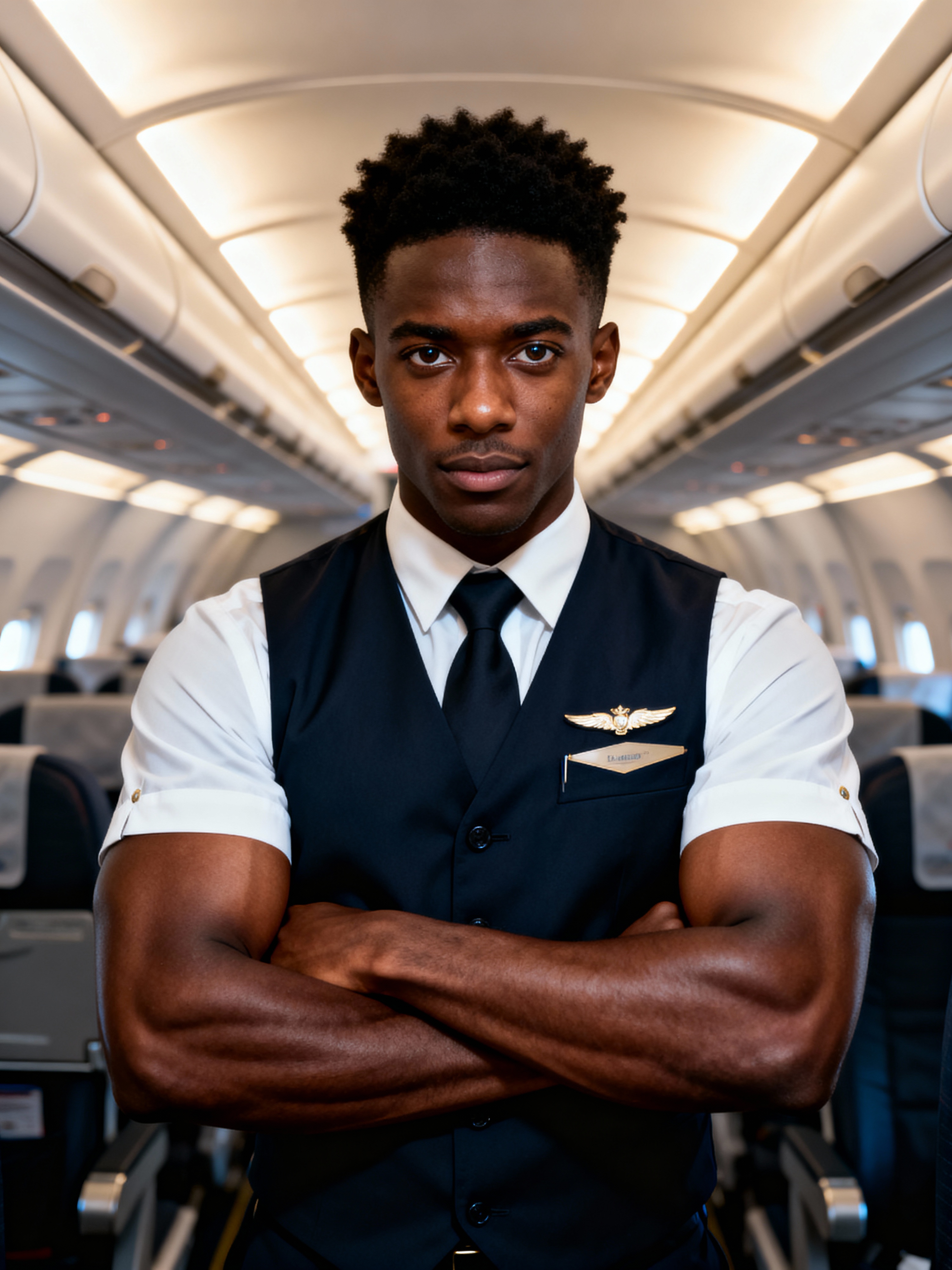 model as a flight attendant in aircraft aisle, wearing a powerful presence in a professional flight attendant uniform with vest and strong arms, performing cabin checks