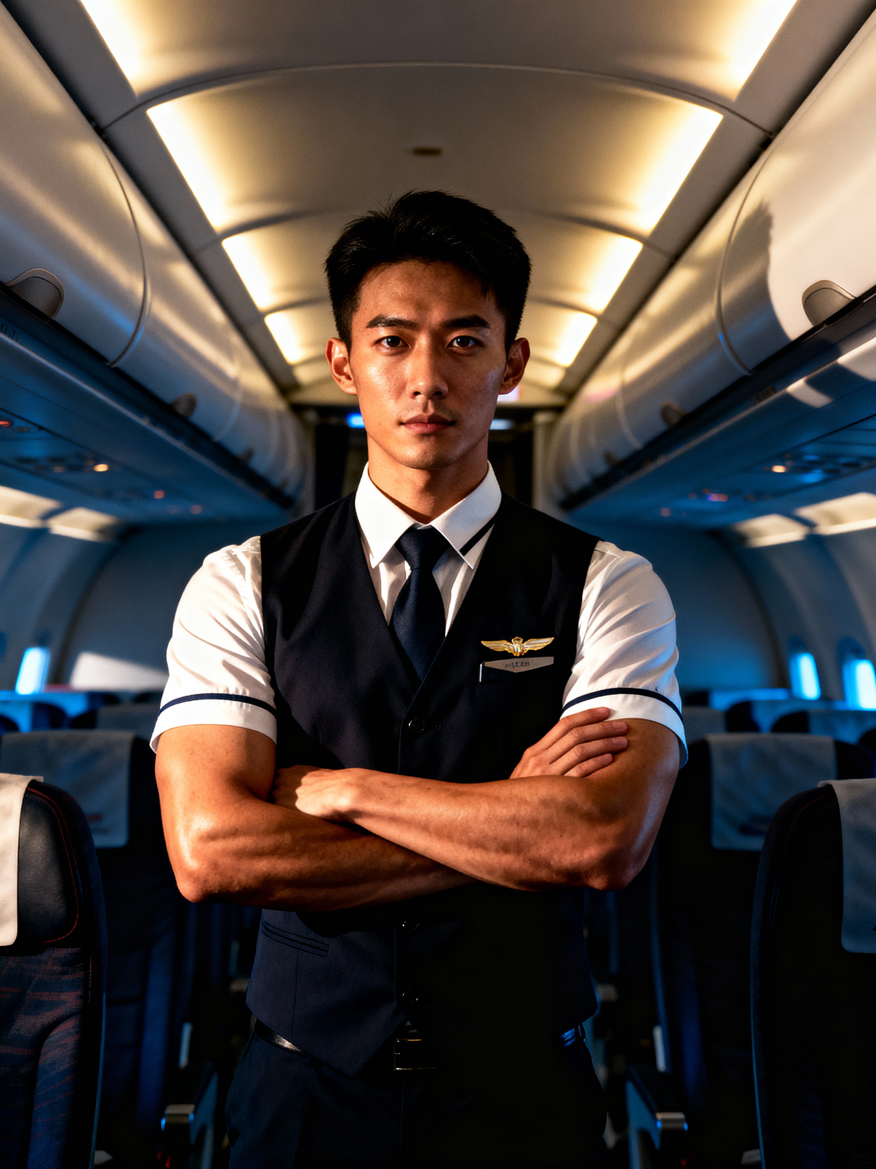 model as a flight attendant in aircraft aisle, wearing a powerful presence in a professional flight attendant uniform with vest and strong arms, performing cabin checks