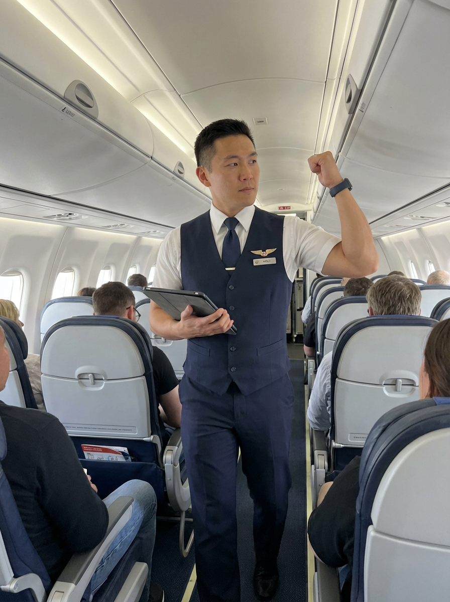 model as a flight attendant in aircraft aisle, wearing a powerful presence in a professional flight attendant uniform with vest and strong arms, performing cabin checks