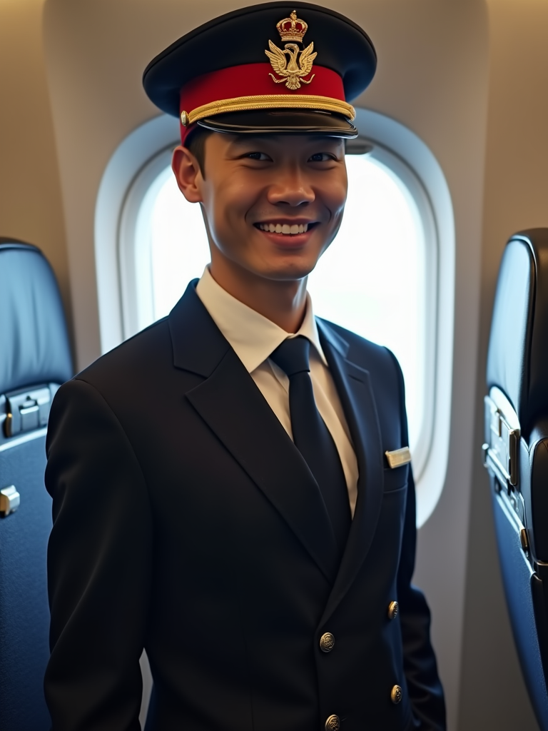 model as a flight attendant in aircraft doorway, wearing an authoritative presence in a professional flight attendant uniform with cap and broad shoulders, greeting passengers during boarding