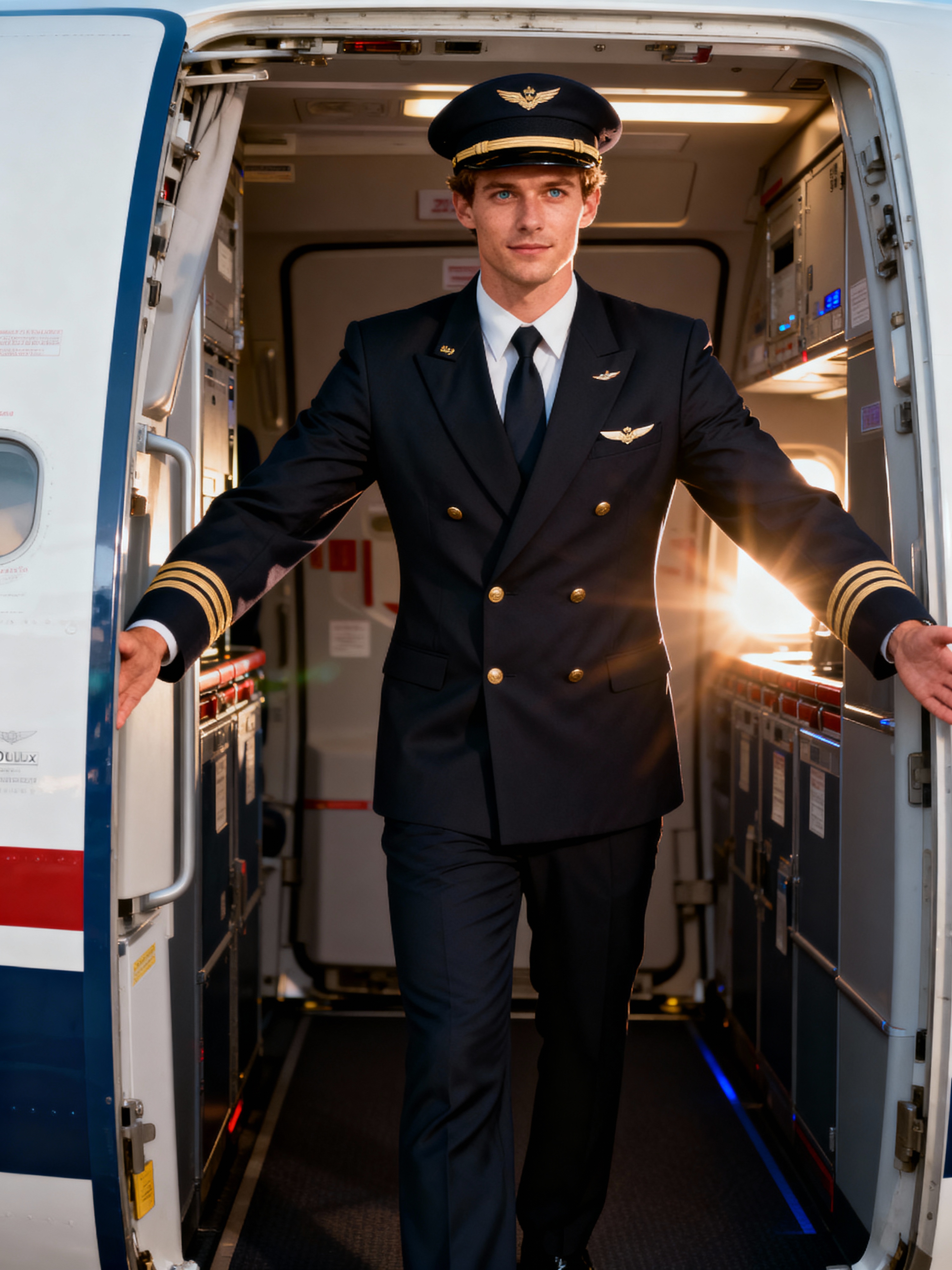 model as a flight attendant in aircraft doorway, wearing an authoritative presence in a professional flight attendant uniform with cap and broad shoulders, greeting passengers during boarding