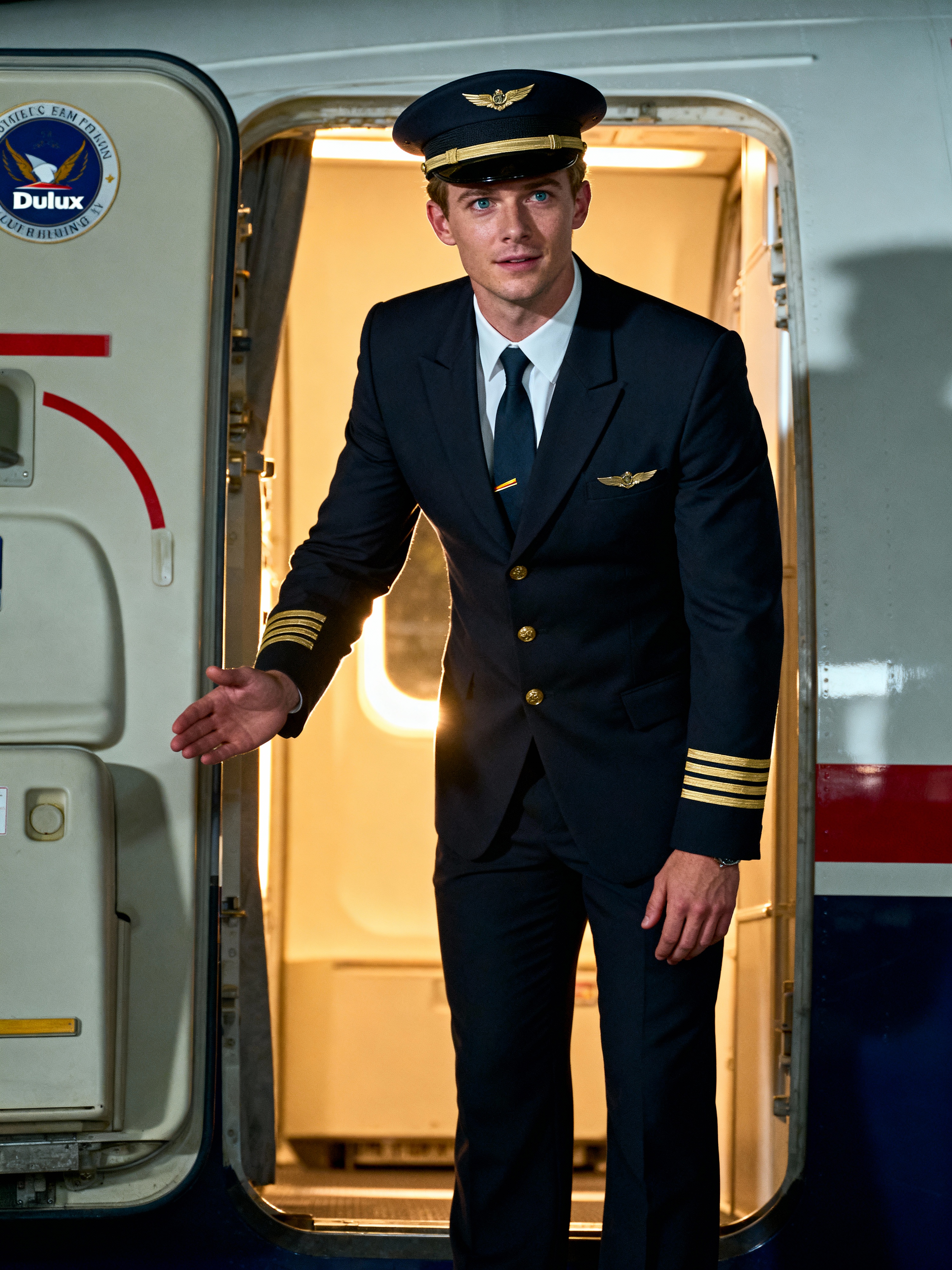 model as a flight attendant in aircraft doorway, wearing an authoritative presence in a professional flight attendant uniform with cap and broad shoulders, greeting passengers during boarding