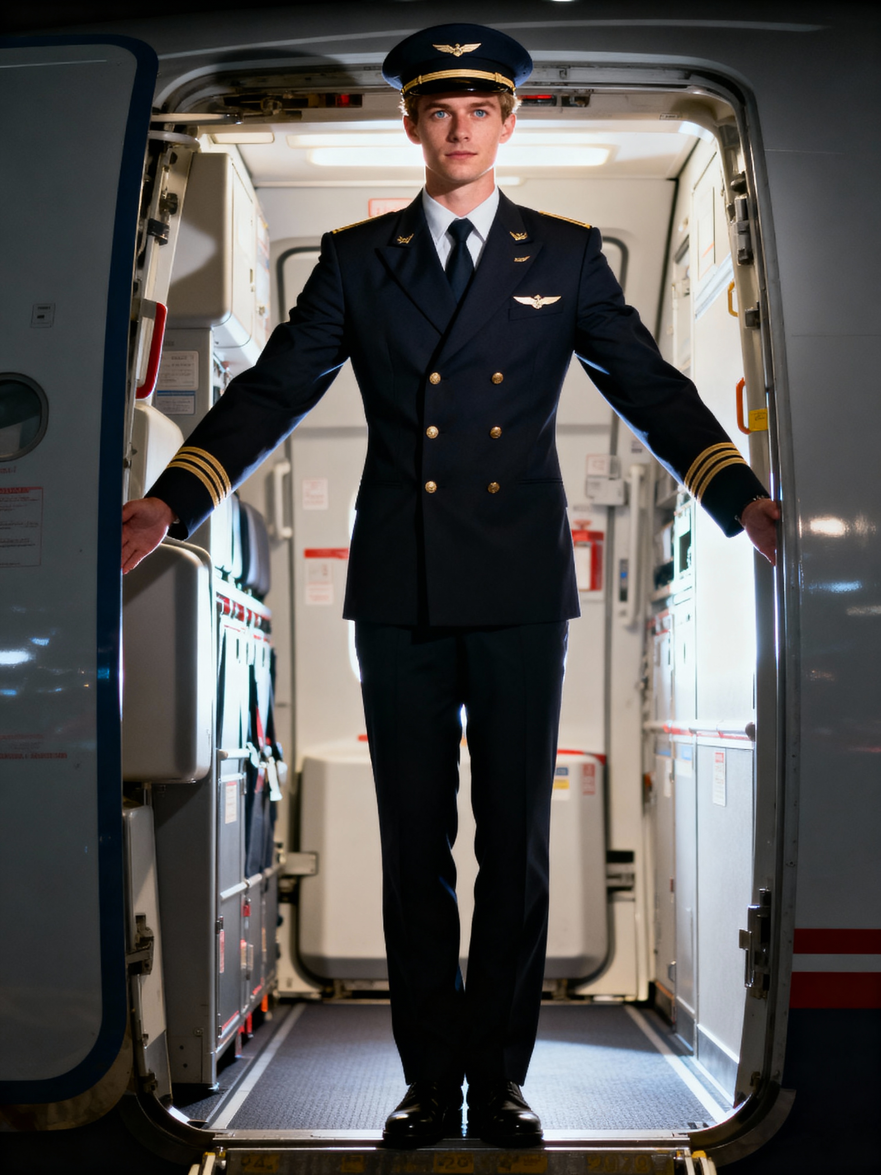 model as a flight attendant in aircraft doorway, wearing an authoritative presence in a professional flight attendant uniform with cap and broad shoulders, greeting passengers during boarding