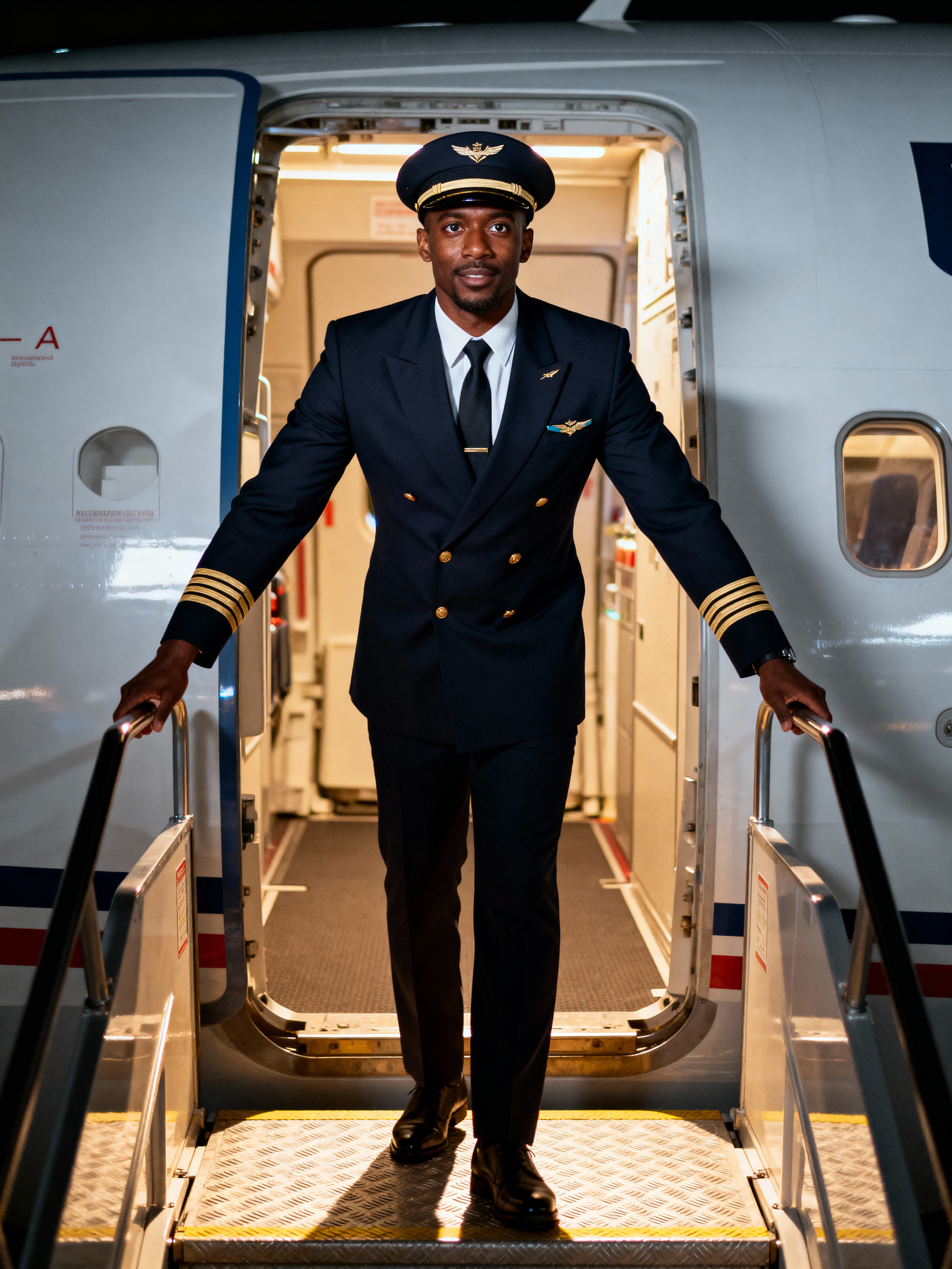 model as a flight attendant in aircraft doorway, wearing an authoritative presence in a professional flight attendant uniform with cap and broad shoulders, greeting passengers during boarding