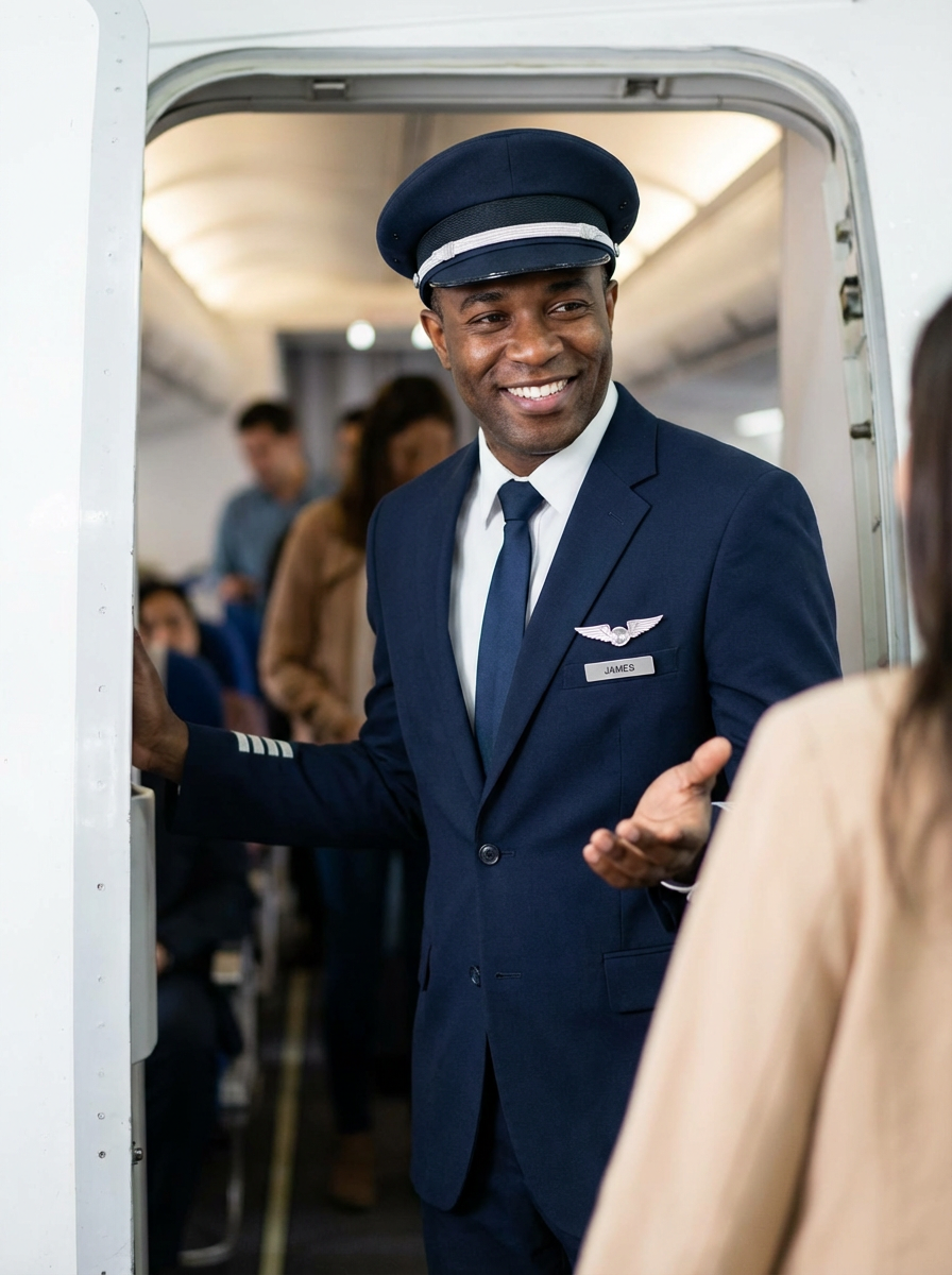 model as a flight attendant in aircraft doorway, wearing an authoritative presence in a professional flight attendant uniform with cap and broad shoulders, greeting passengers during boarding