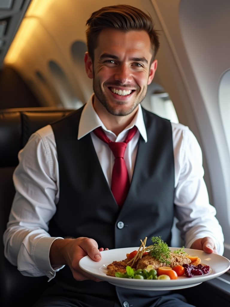 model as a flight attendant in business class, wearing a powerful presence in a premium flight attendant uniform with vest and broad chest, serving gourmet meals on long-haul flight