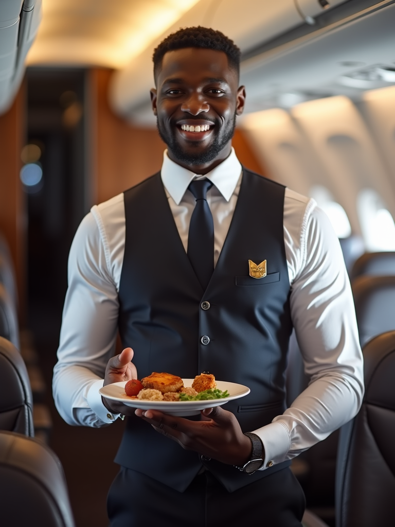 model as a flight attendant in business class, wearing a powerful presence in a premium flight attendant uniform with vest and broad chest, serving gourmet meals on long-haul flight