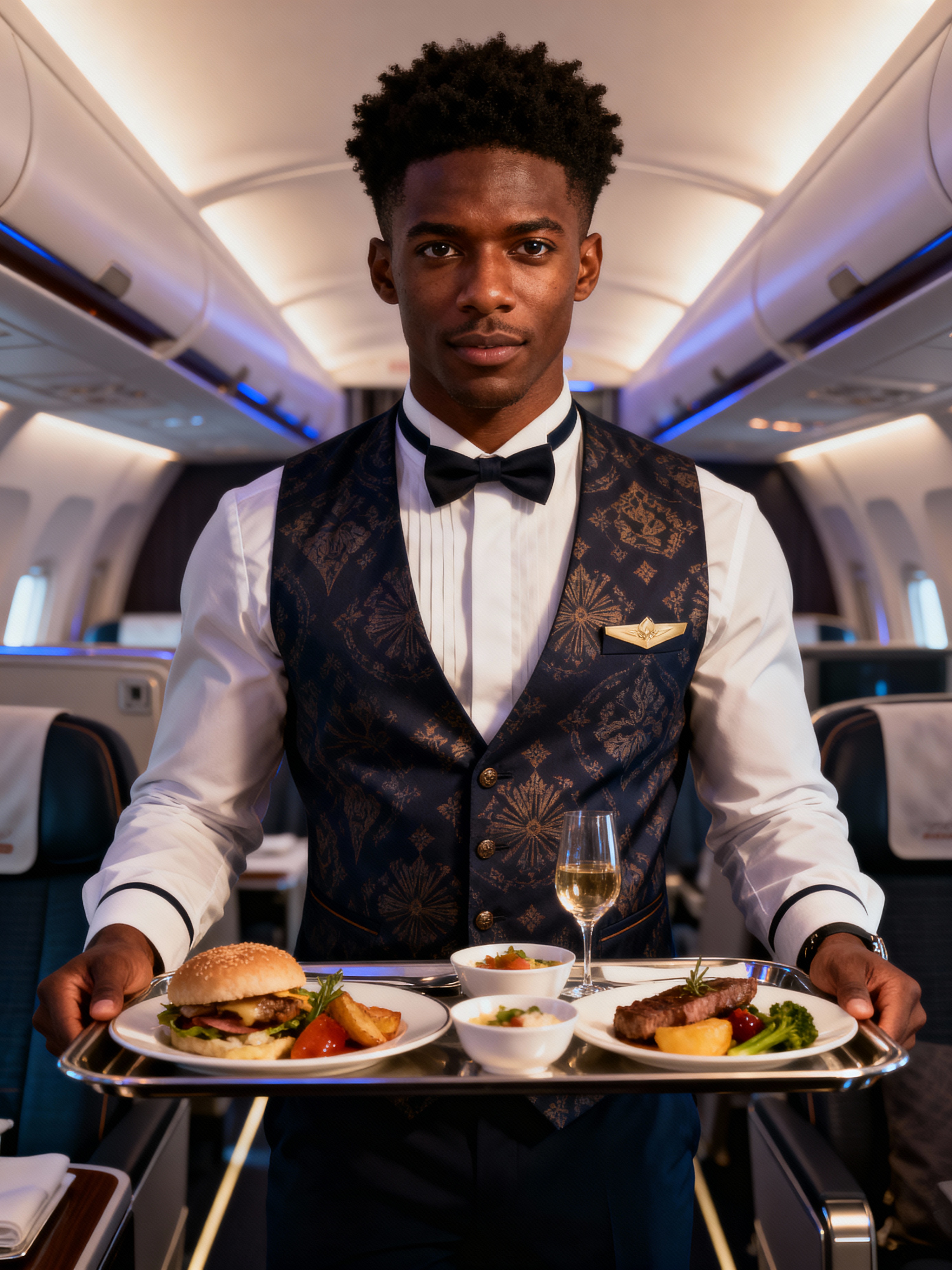 model as a flight attendant in business class, wearing a powerful presence in a premium flight attendant uniform with vest and broad chest, serving gourmet meals on long-haul flight