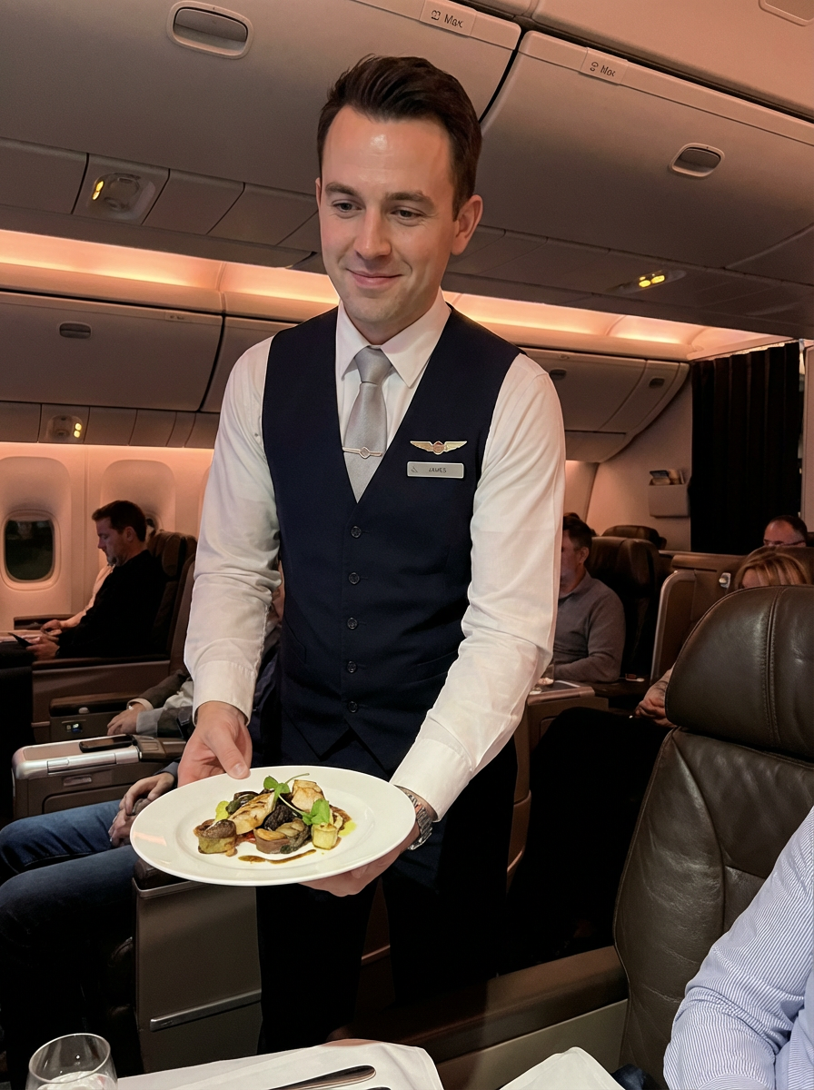 model as a flight attendant in business class, wearing a powerful presence in a premium flight attendant uniform with vest and broad chest, serving gourmet meals on long-haul flight