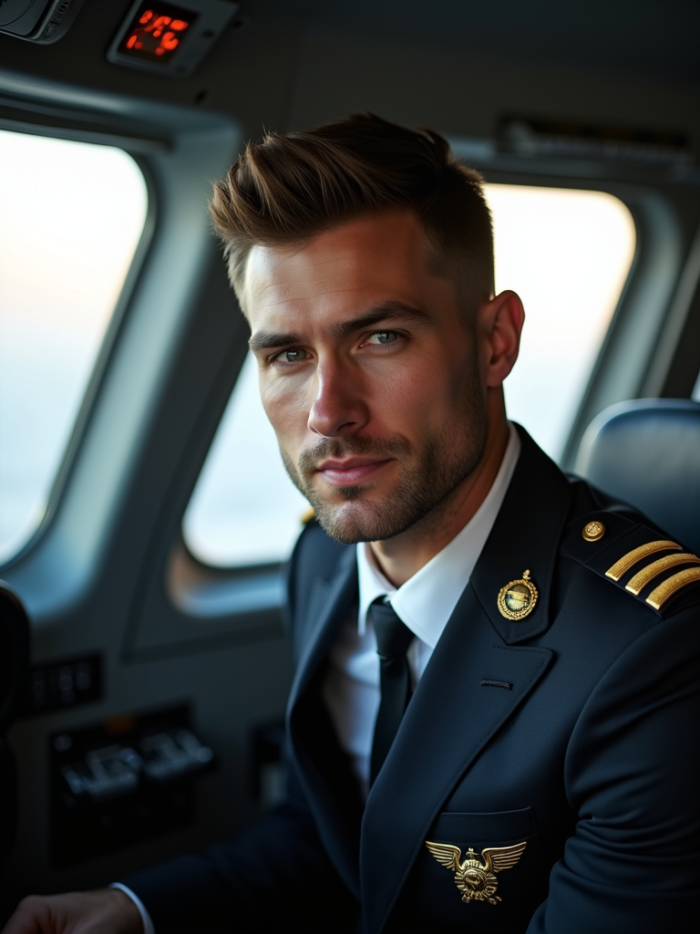 model as a flight attendant in cockpit, wearing a commanding presence in a professional flight attendant uniform with wings badge and strong features, sitting in pilot seat during pre-flight check