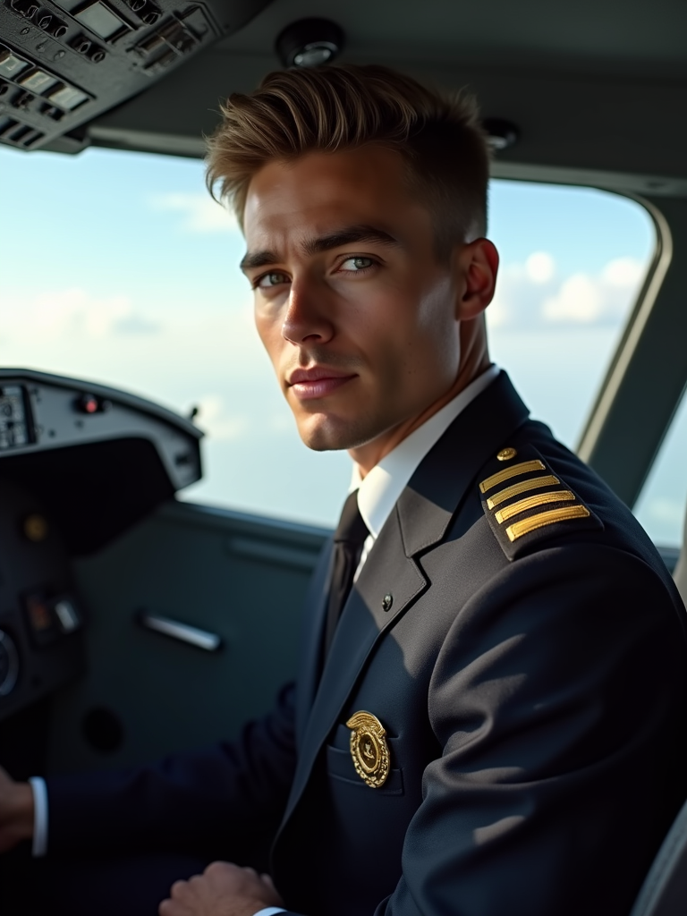 model as a flight attendant in cockpit, wearing a commanding presence in a professional flight attendant uniform with wings badge and strong features, sitting in pilot seat during pre-flight check
