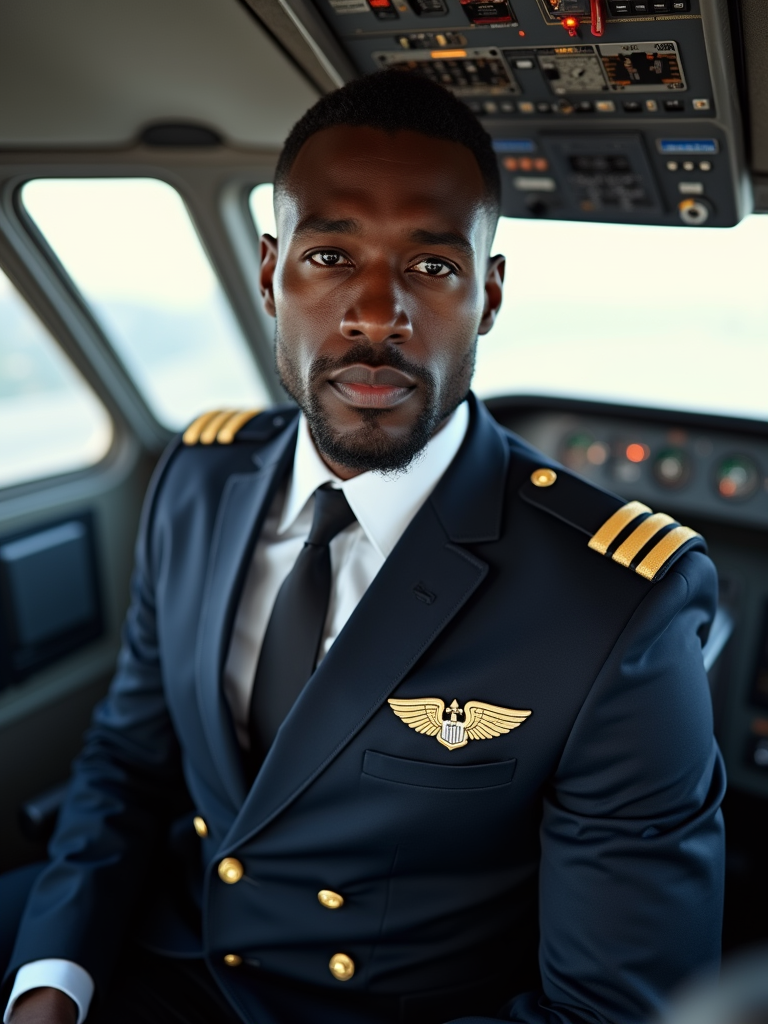 model as a flight attendant in cockpit, wearing a commanding presence in a professional flight attendant uniform with wings badge and strong features, sitting in pilot seat during pre-flight check
