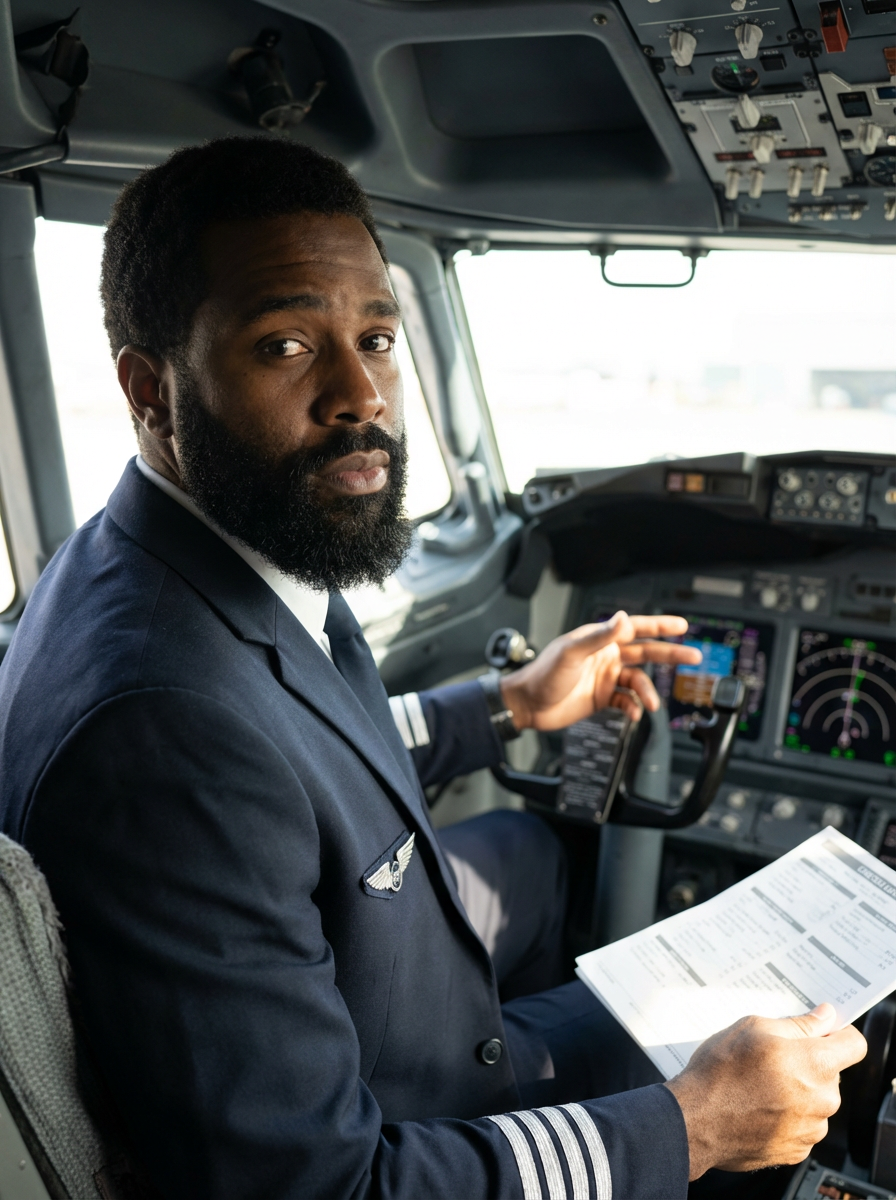 model as a flight attendant in cockpit, wearing a commanding presence in a professional flight attendant uniform with wings badge and strong features, sitting in pilot seat during pre-flight check
