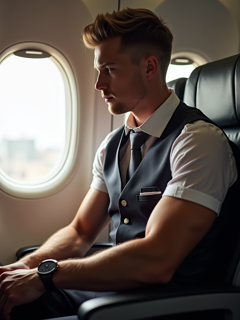 model as a flight attendant in crew rest area, wearing a powerful presence in a casual version of flight attendant uniform with strong arms, taking a short break during long-haul flight