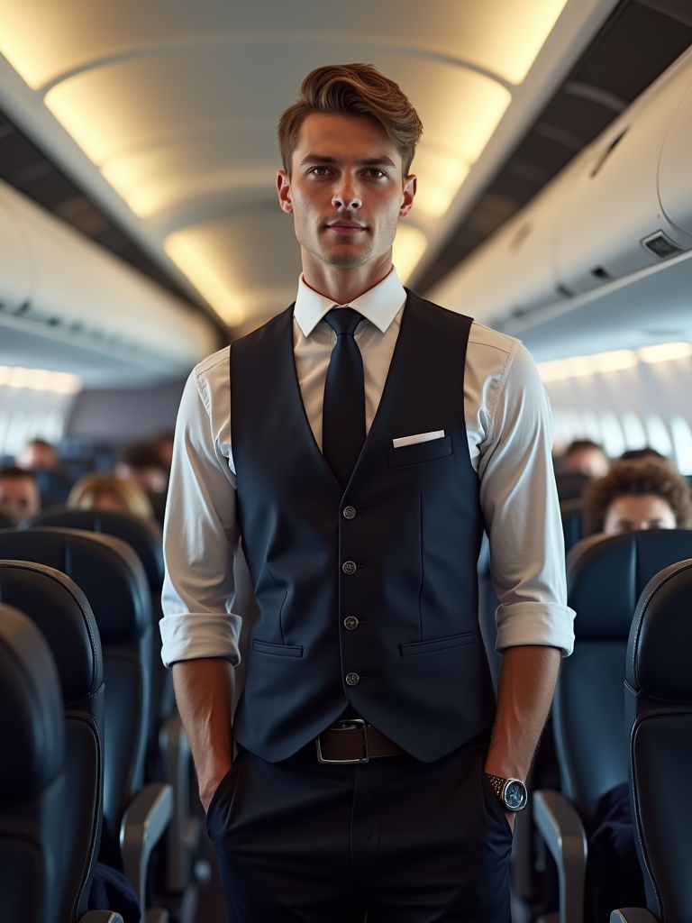 model as a flight attendant in crew rest area, wearing a powerful presence in a casual version of flight attendant uniform with strong arms, taking a short break during long-haul flight