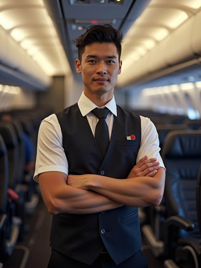 model as a flight attendant in crew rest area, wearing a powerful presence in a casual version of flight attendant uniform with strong arms, taking a short break during long-haul flight
