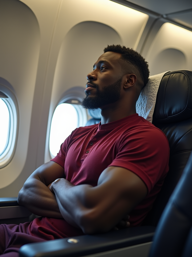 model as a flight attendant in crew rest area, wearing a powerful presence in a casual version of flight attendant uniform with strong arms, taking a short break during long-haul flight