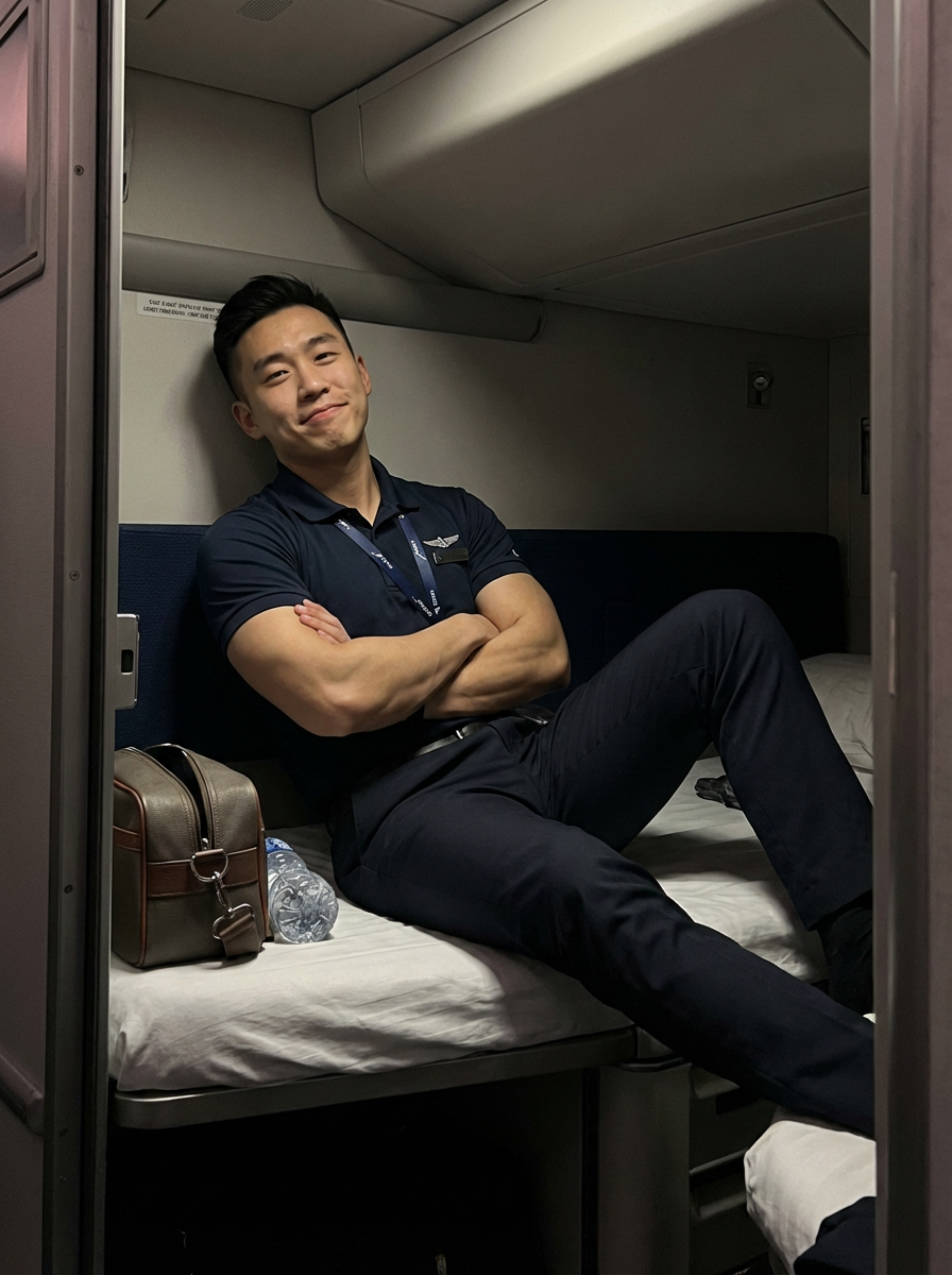 model as a flight attendant in crew rest area, wearing a powerful presence in a casual version of flight attendant uniform with strong arms, taking a short break during long-haul flight