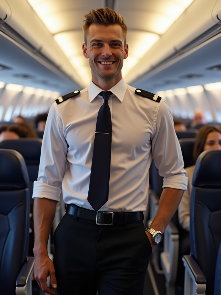 model as a flight attendant in economy cabin, wearing a dominant presence in a neat flight attendant uniform with tie and muscular build, demonstrating emergency exit procedures
