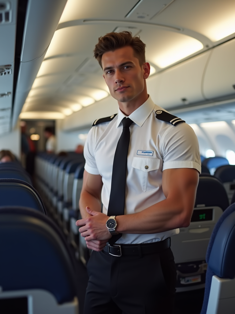 model as a flight attendant in economy cabin, wearing a dominant presence in a neat flight attendant uniform with tie and muscular build, demonstrating emergency exit procedures