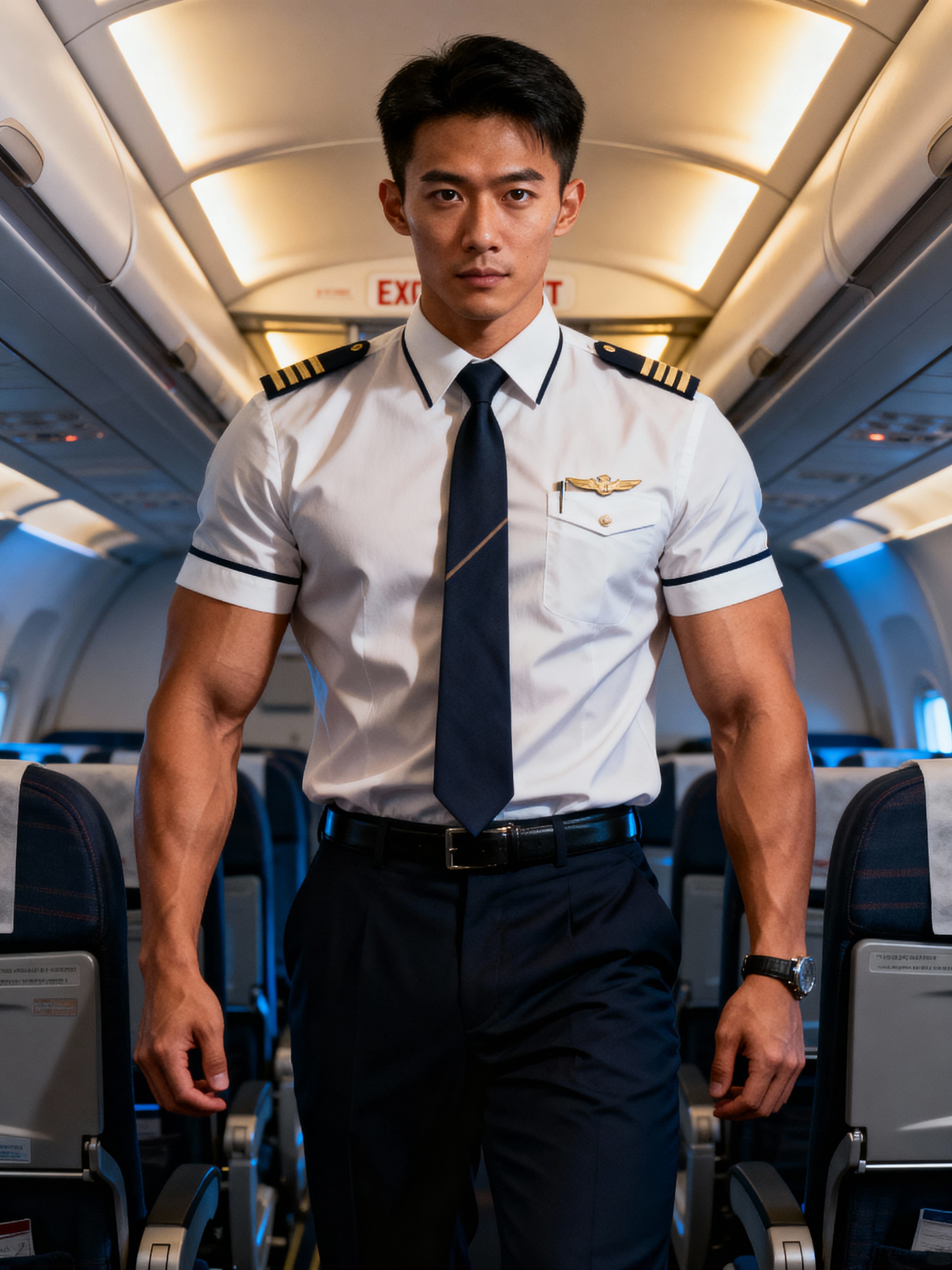 model as a flight attendant in economy cabin, wearing a dominant presence in a neat flight attendant uniform with tie and muscular build, demonstrating emergency exit procedures