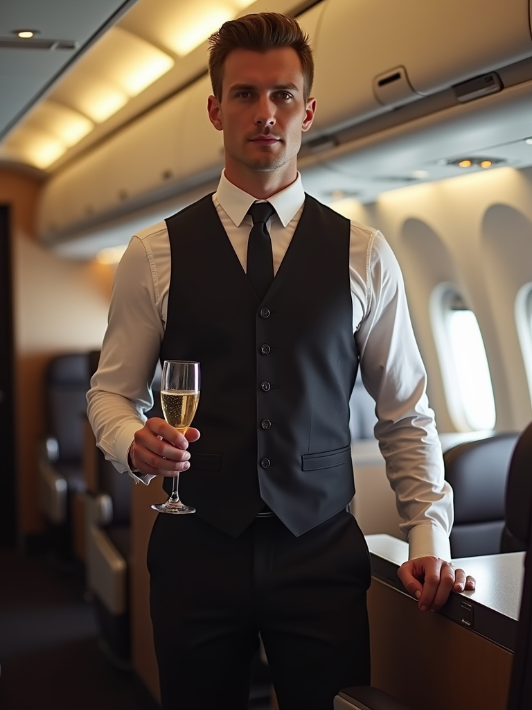 model as a flight attendant in first class cabin, wearing a dominant presence in a premium flight attendant uniform with vest and tie, broad shoulders, serving champagne to passengers
