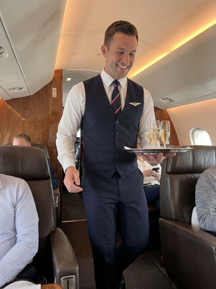 model as a flight attendant in first class cabin, wearing a dominant presence in a premium flight attendant uniform with vest and tie, broad shoulders, serving champagne to passengers