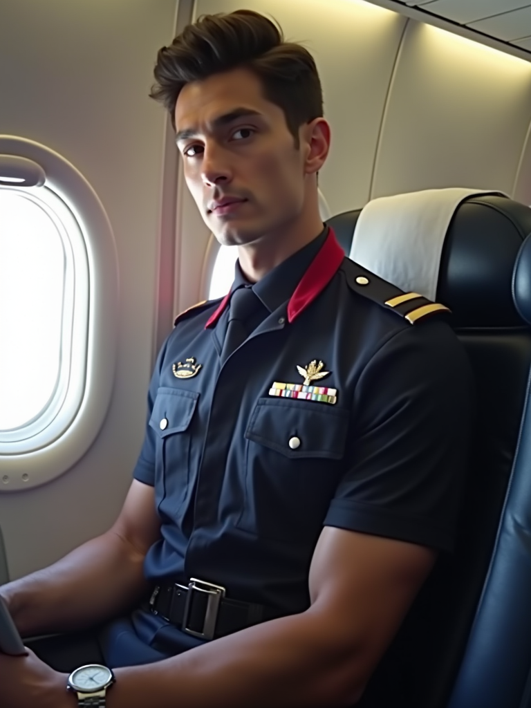 model as a flight attendant in jumpseat, wearing a commanding presence in a standard flight attendant uniform with seatbelt and muscular frame, preparing for landing