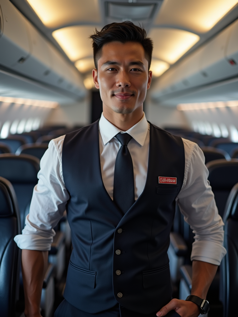 model as a flight attendant in jumpseat, wearing a commanding presence in a standard flight attendant uniform with seatbelt and muscular frame, preparing for landing