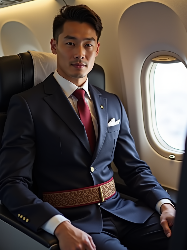 model as a flight attendant in jumpseat, wearing a commanding presence in a standard flight attendant uniform with seatbelt and muscular frame, preparing for landing
