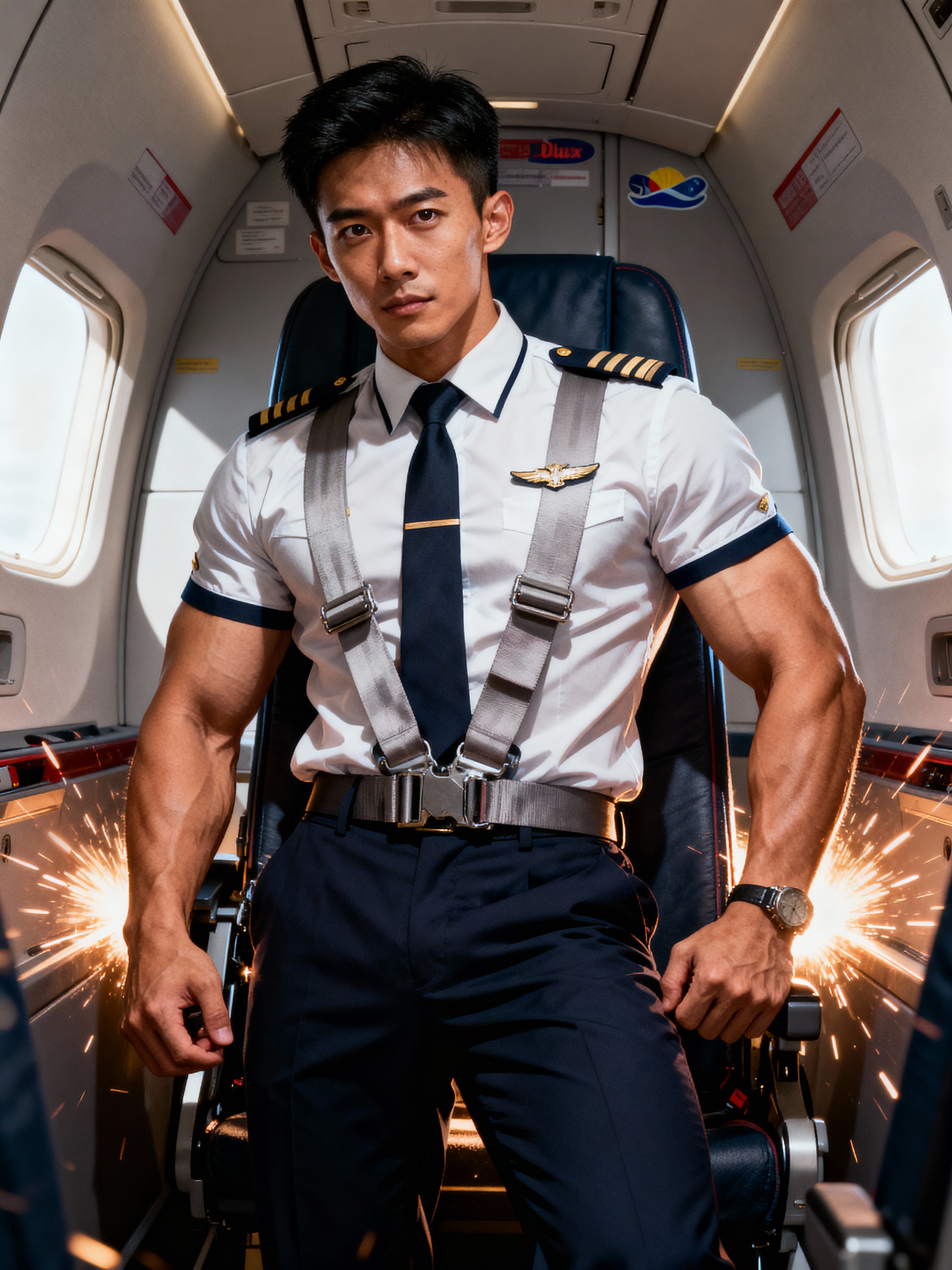 model as a flight attendant in jumpseat, wearing a commanding presence in a standard flight attendant uniform with seatbelt and muscular frame, preparing for landing