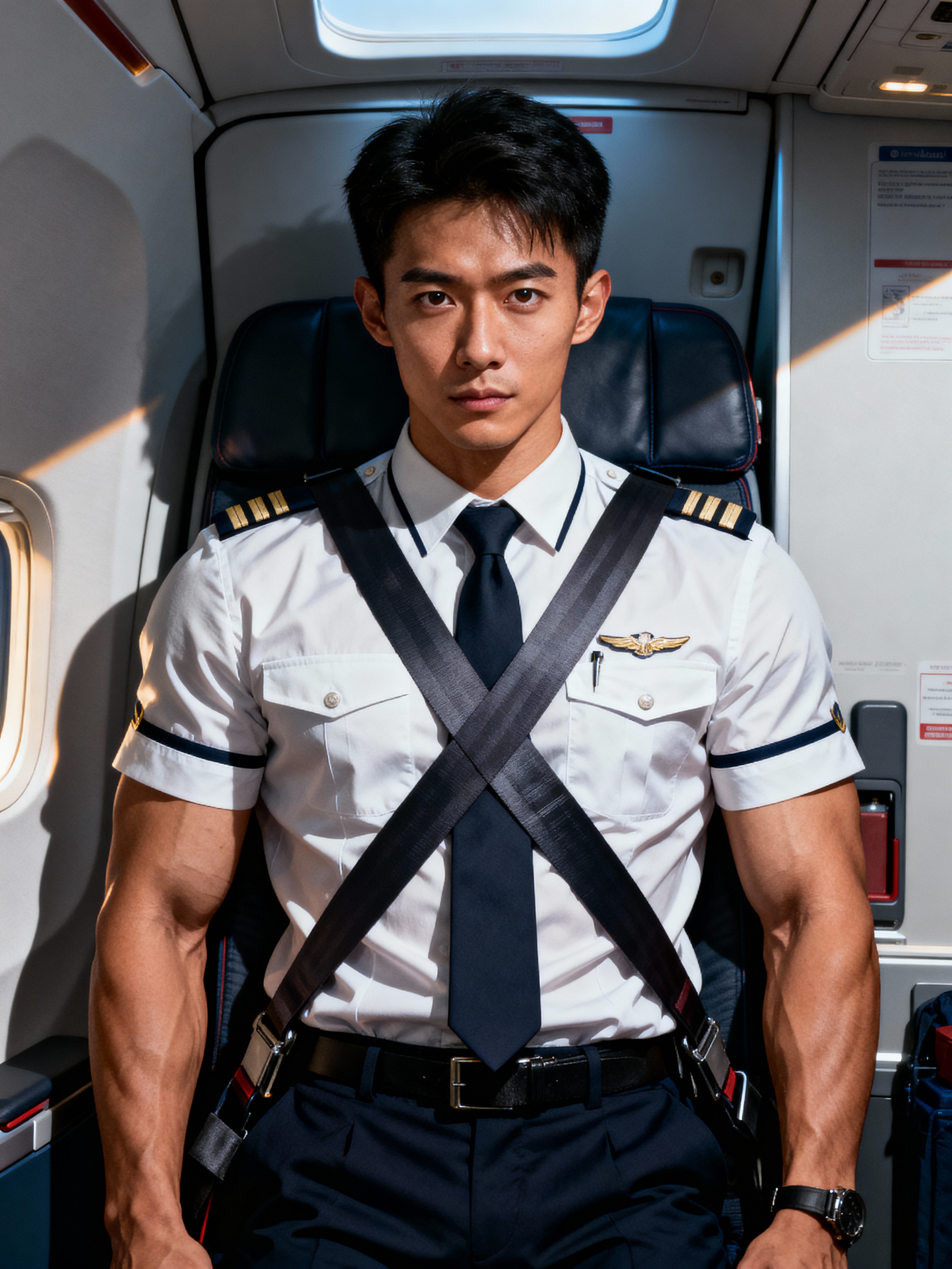 model as a flight attendant in jumpseat, wearing a commanding presence in a standard flight attendant uniform with seatbelt and muscular frame, preparing for landing