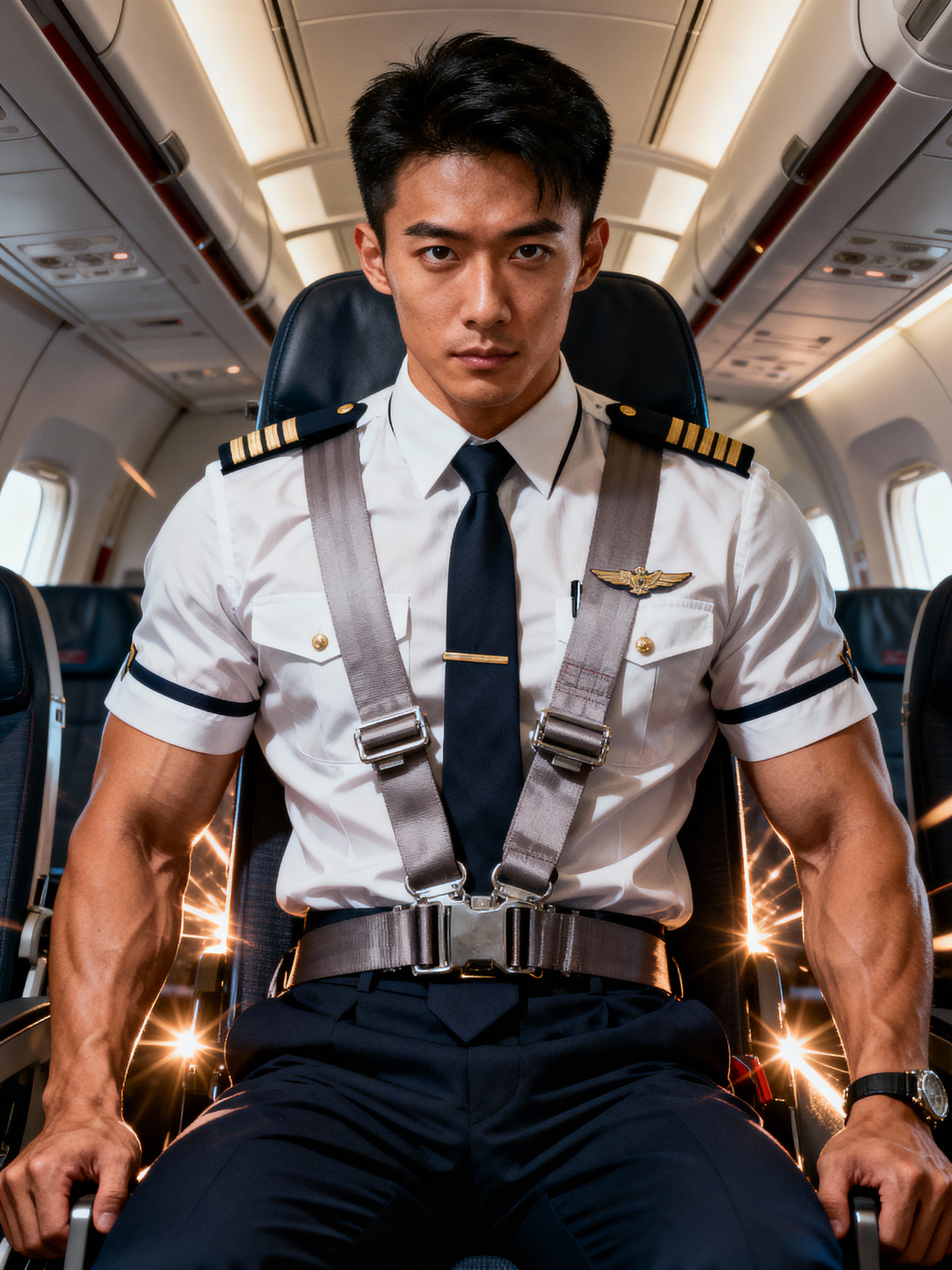 model as a flight attendant in jumpseat, wearing a commanding presence in a standard flight attendant uniform with seatbelt and muscular frame, preparing for landing