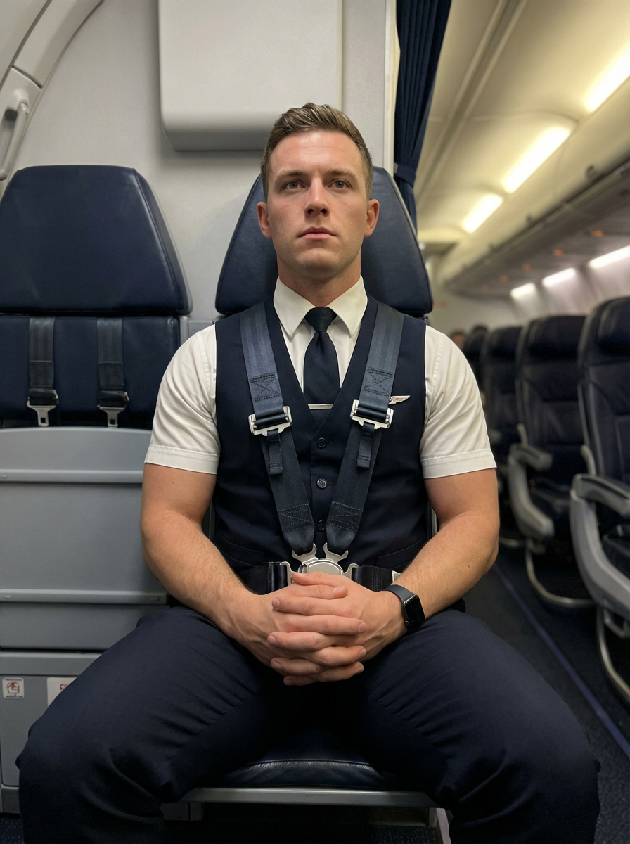 model as a flight attendant in jumpseat, wearing a commanding presence in a standard flight attendant uniform with seatbelt and muscular frame, preparing for landing