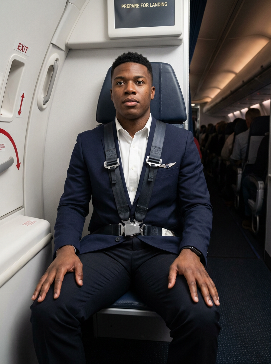 model as a flight attendant in jumpseat, wearing a commanding presence in a standard flight attendant uniform with seatbelt and muscular frame, preparing for landing
