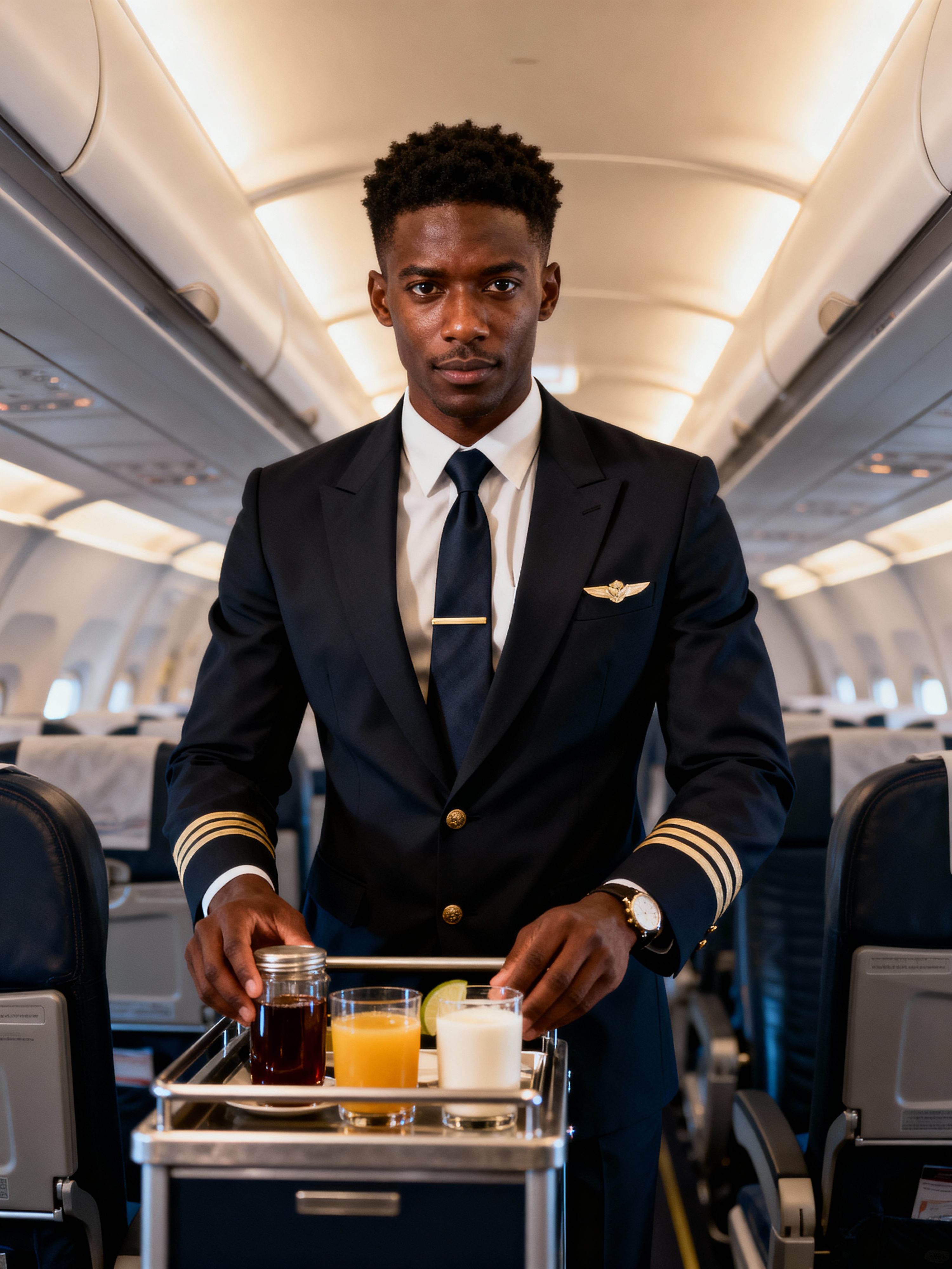 model as a flight attendant in premium economy section, wearing a dominant presence in a tailored flight attendant uniform with tie and broad chest, serving refreshments from trolley