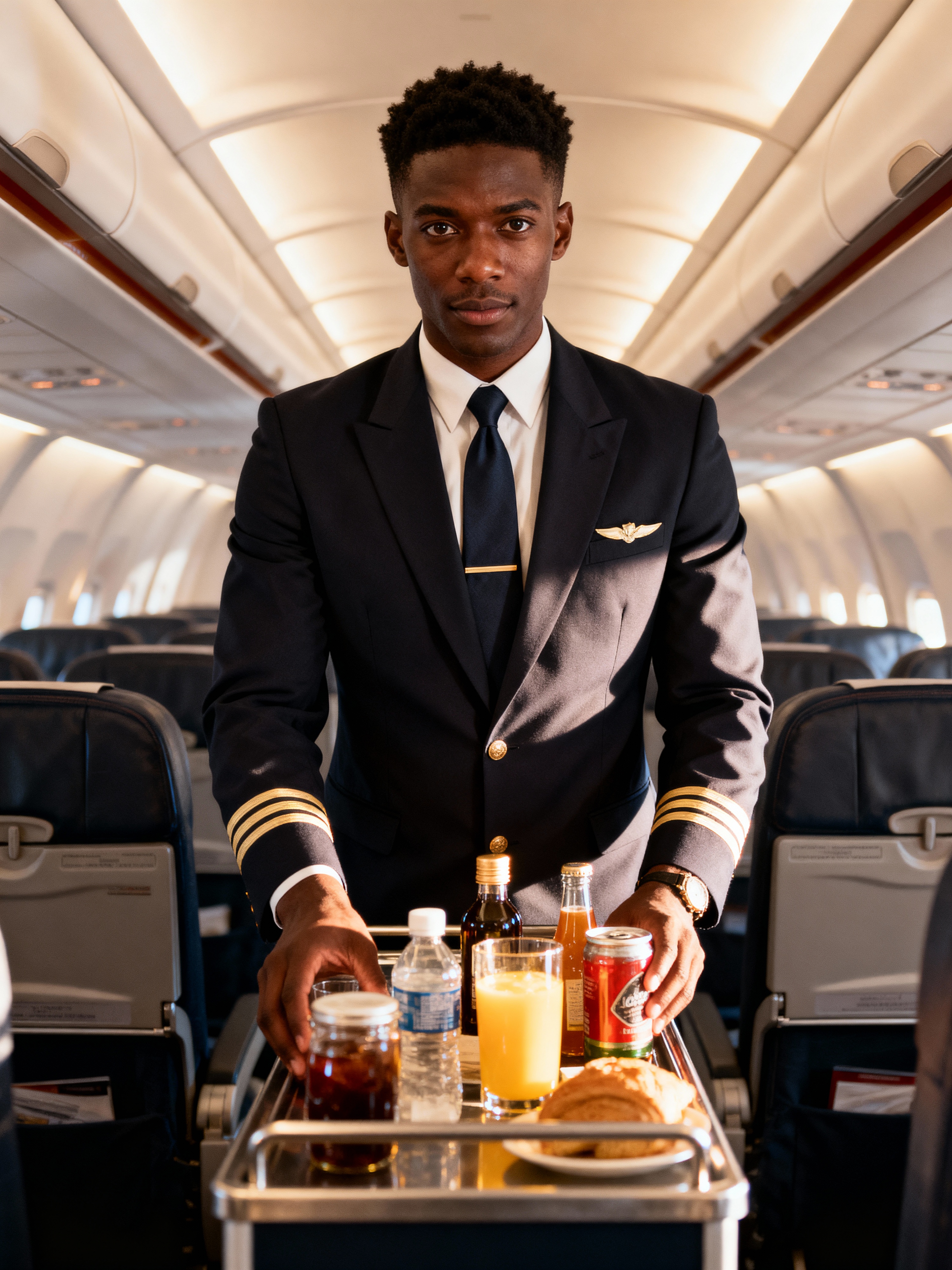 model as a flight attendant in premium economy section, wearing a dominant presence in a tailored flight attendant uniform with tie and broad chest, serving refreshments from trolley