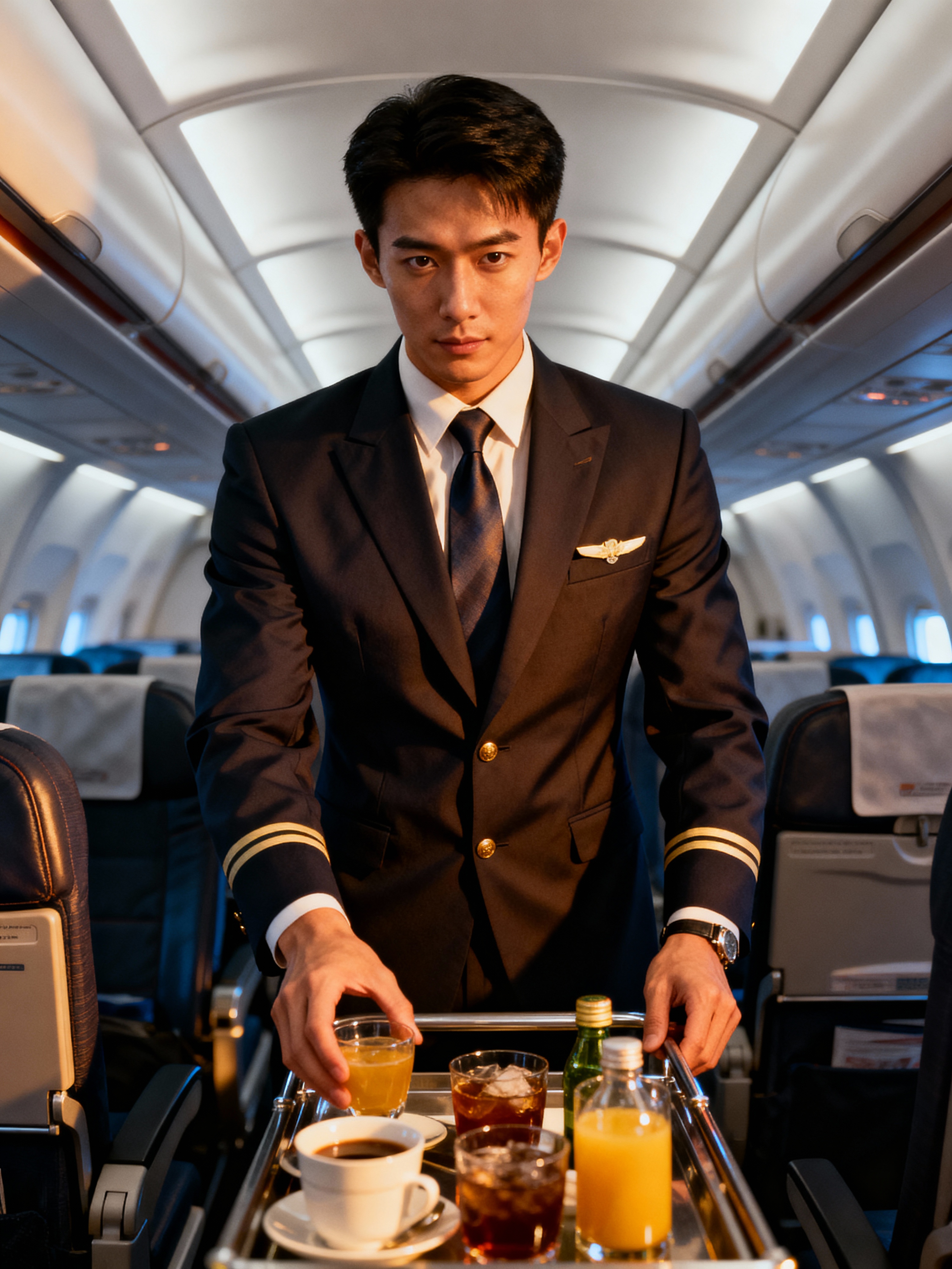 model as a flight attendant in premium economy section, wearing a dominant presence in a tailored flight attendant uniform with tie and broad chest, serving refreshments from trolley