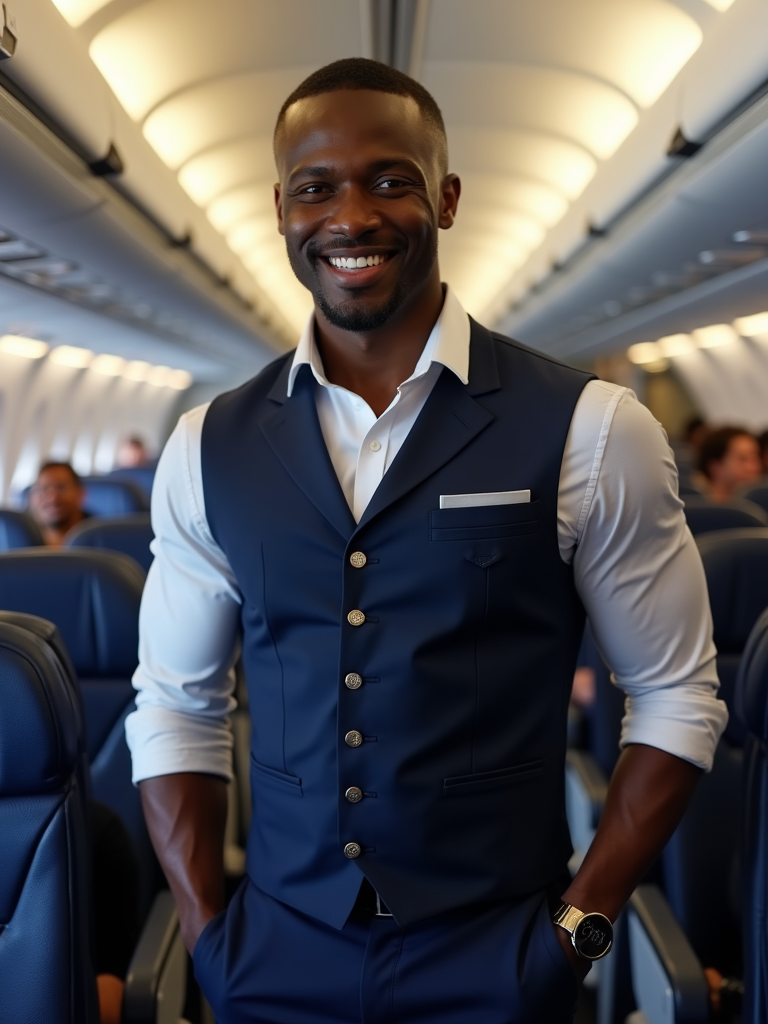 model as a flight attendant in the airplane cabin, wearing a muscular frame in a tailored navy blue flight attendant uniform with broad shoulders and strong arms, seductive smile while serving passengers