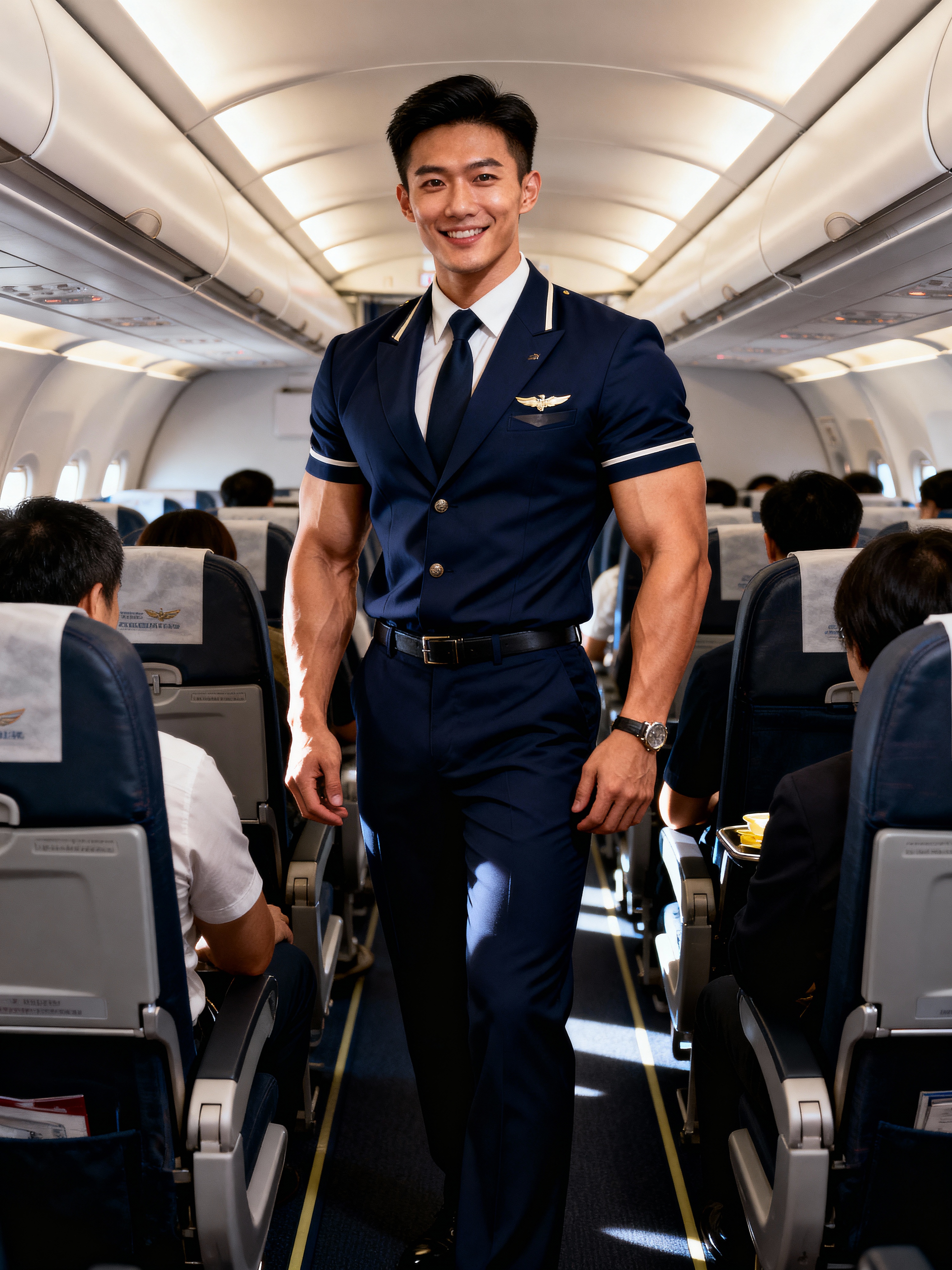 model as a flight attendant in the airplane cabin, wearing a muscular frame in a tailored navy blue flight attendant uniform with broad shoulders and strong arms, seductive smile while serving passengers
