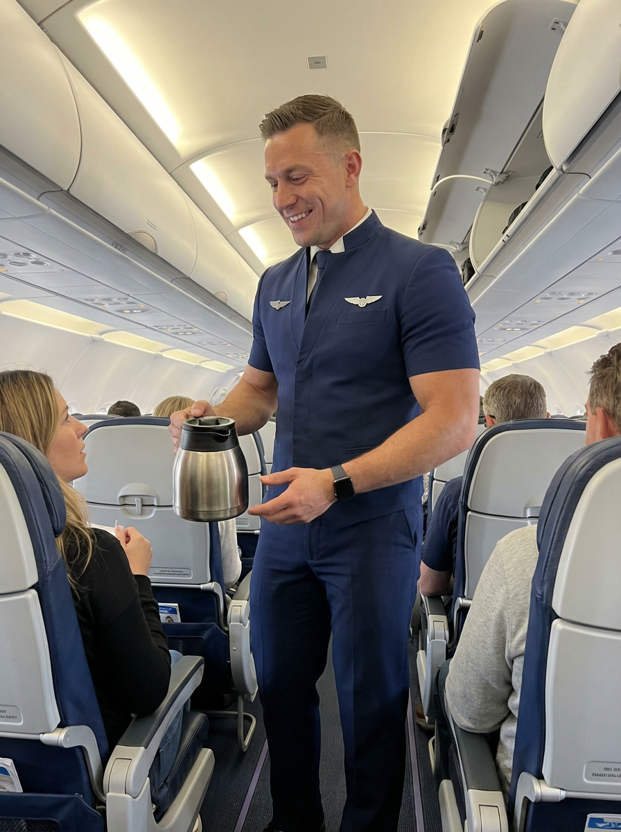 model as a flight attendant in the airplane cabin, wearing a muscular frame in a tailored navy blue flight attendant uniform with broad shoulders and strong arms, seductive smile while serving passengers