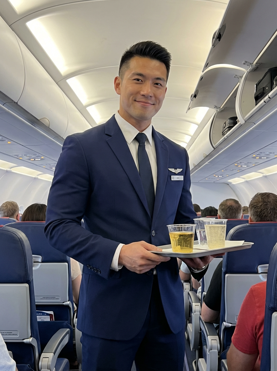 model as a flight attendant in the airplane cabin, wearing a muscular frame in a tailored navy blue flight attendant uniform with broad shoulders and strong arms, seductive smile while serving passengers