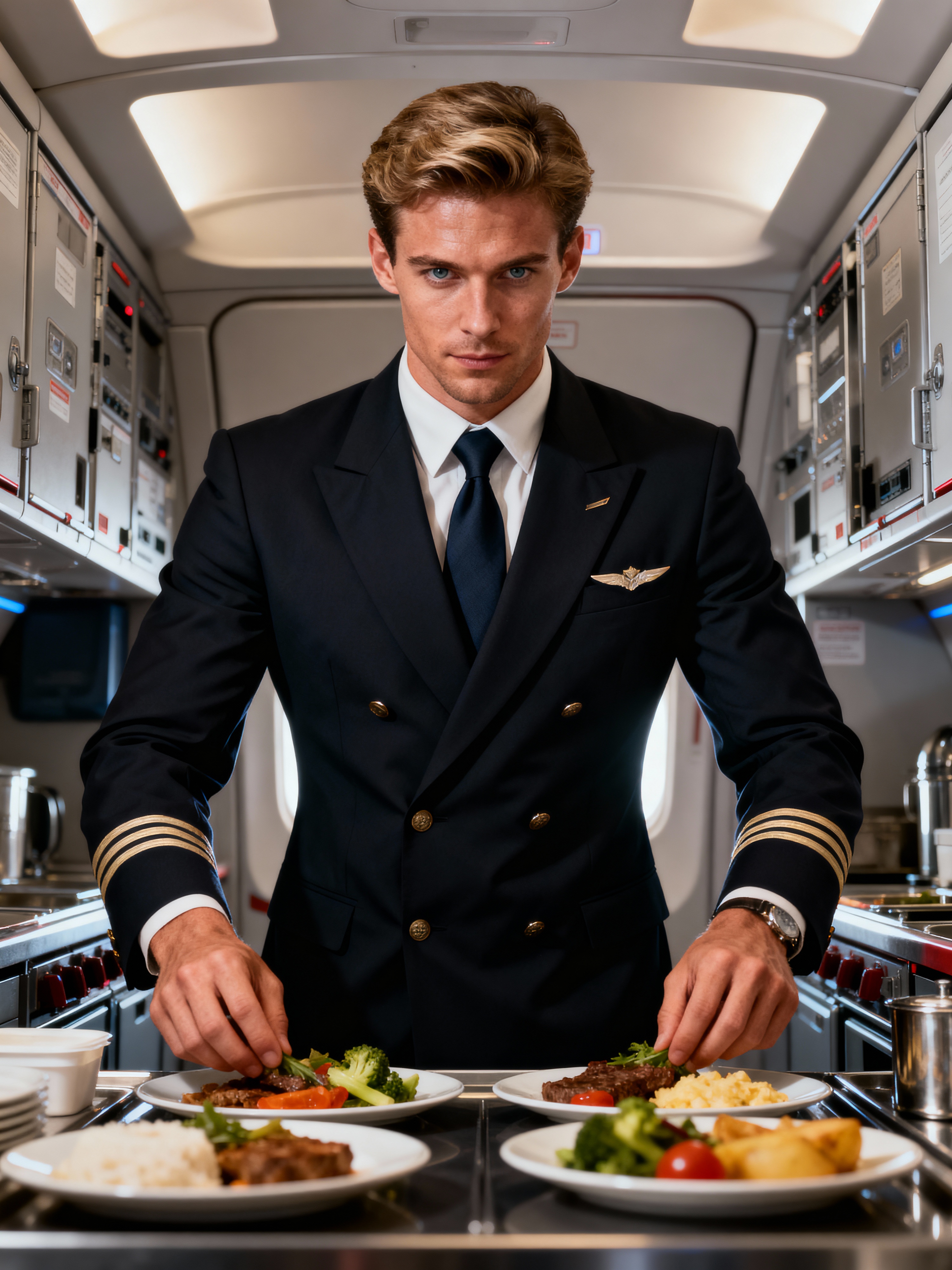 model as a flight attendant in the galley of a modern aircraft, wearing a powerful stance in a well-fitted flight attendant uniform with tie and strong jawline, preparing meal service
