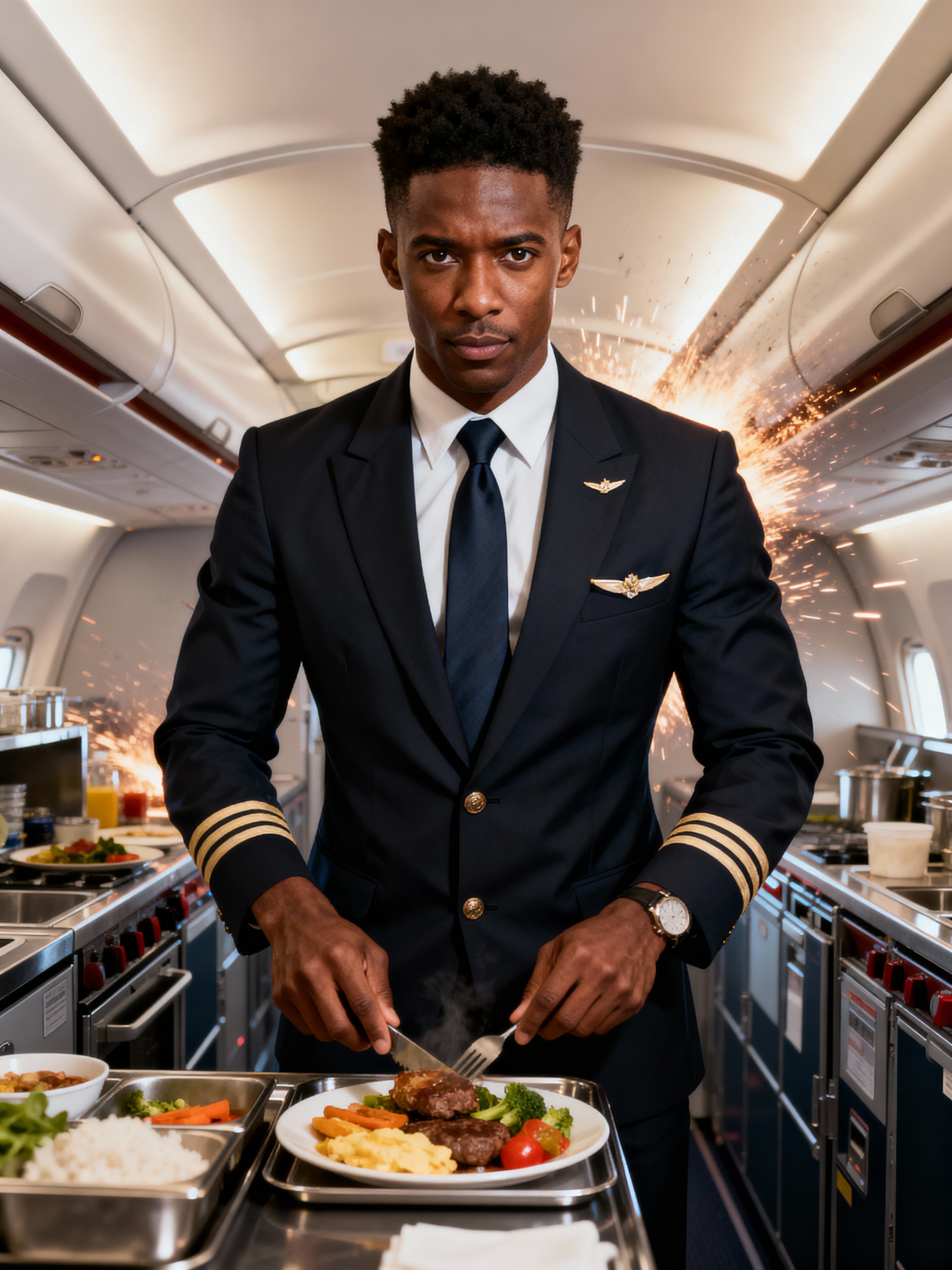 model as a flight attendant in the galley of a modern aircraft, wearing a powerful stance in a well-fitted flight attendant uniform with tie and strong jawline, preparing meal service
