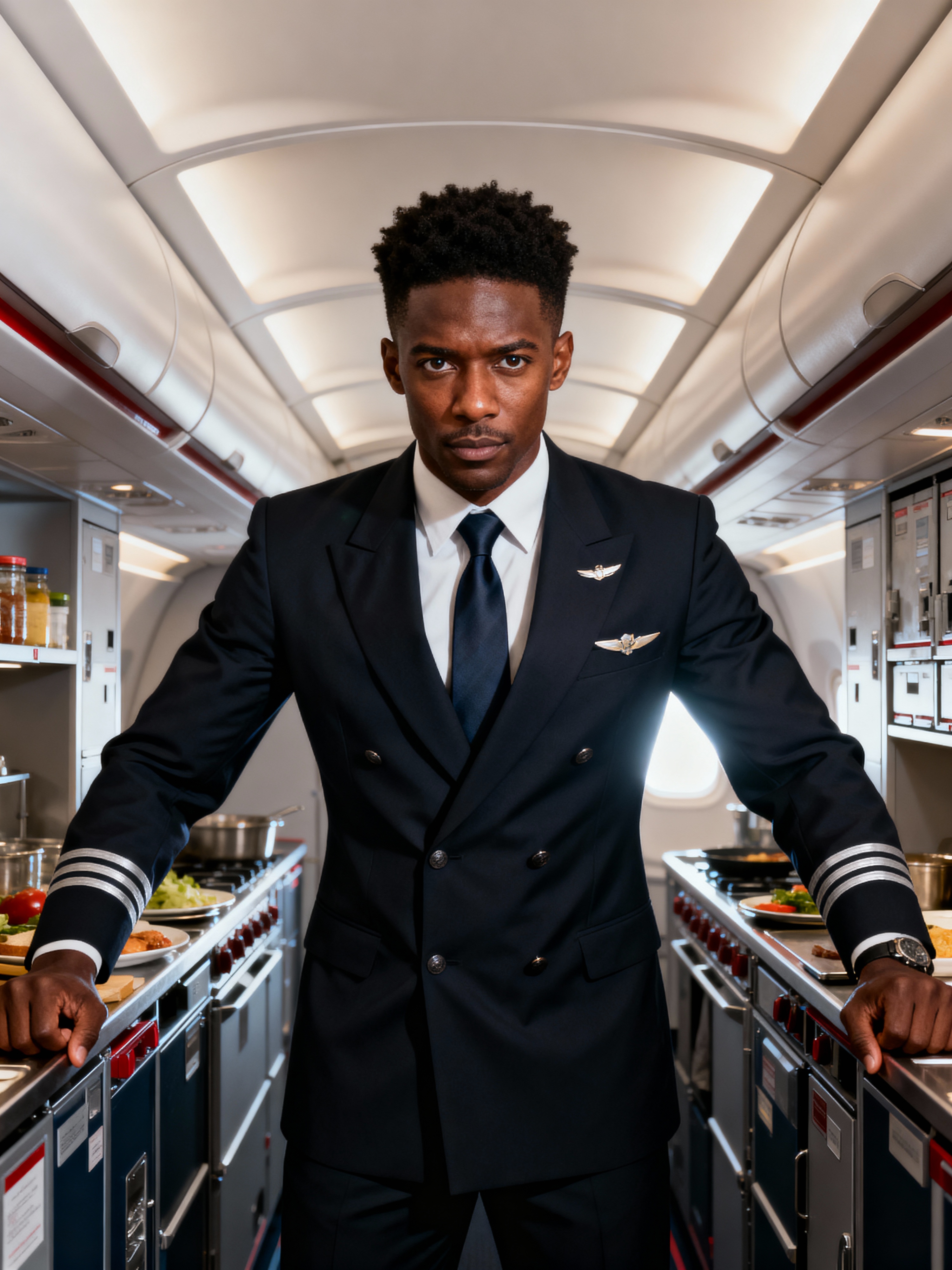 model as a flight attendant in the galley of a modern aircraft, wearing a powerful stance in a well-fitted flight attendant uniform with tie and strong jawline, preparing meal service